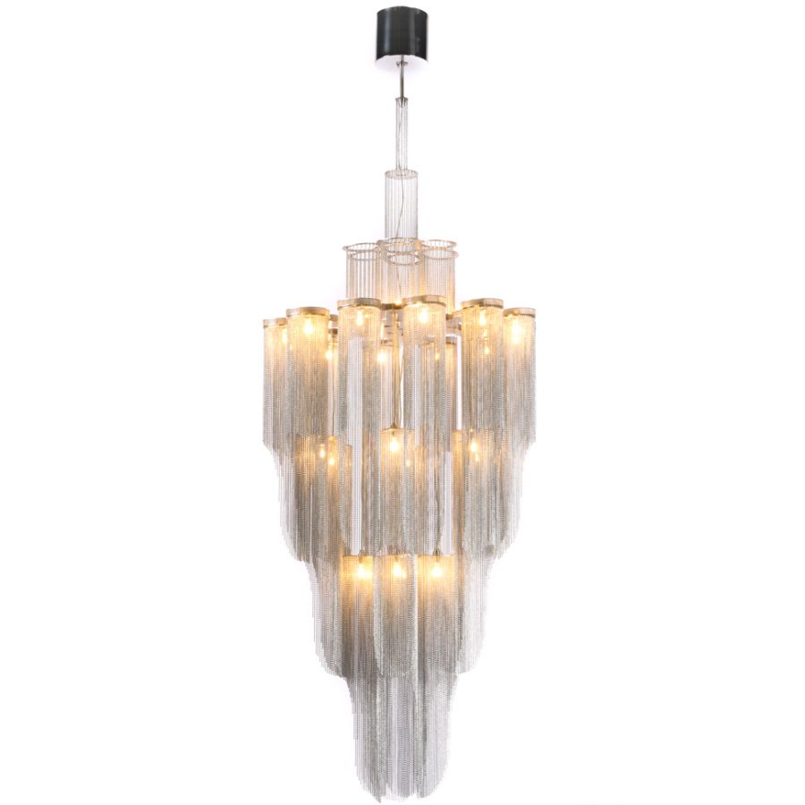A poetic interpretation of traditional bamboo windchime forms. The design is a circular tiered arrangement of repeated `windchimes`. The chandelier is illuminated by 24x G4 LED`s in each windchime as well as 6 LEDs on top of the main frame which illuminate and cast dramatic shadows onto the ceiling. Designed by Adam Hoets in 2017.