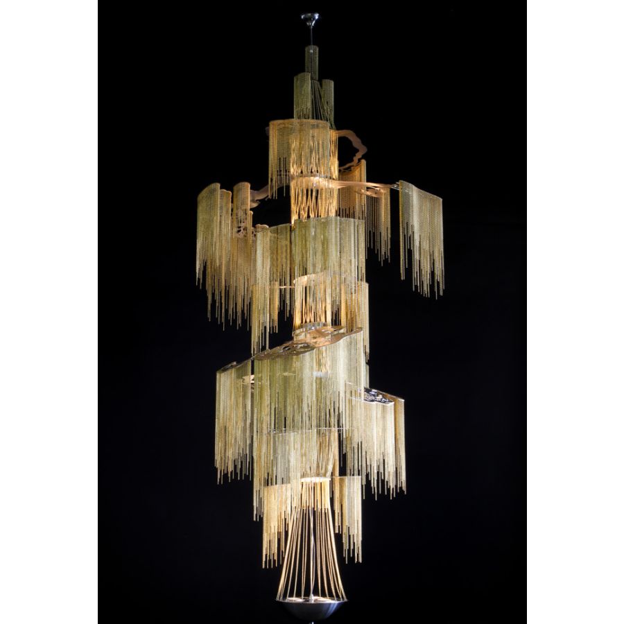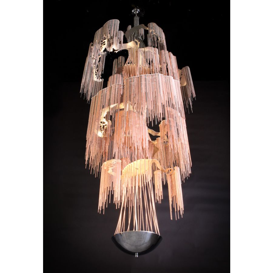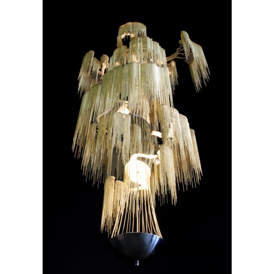 A scupltural tree art-chandelier constructed from a series of eight (8) bowing, counterbalancing branches hanging from one another down a central `trunk`. Illuminated by 2 electrical systems one using 8 G9 Halogen or LED lamps at nodes between branches and another using 3xGU.10 Halogen or LED spotlights housed in a suspended uplighter dish.