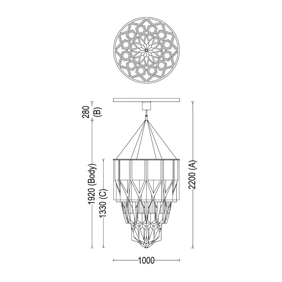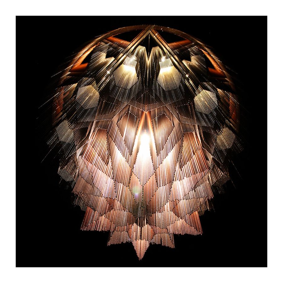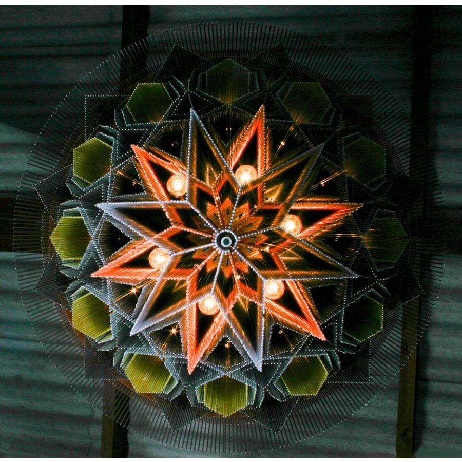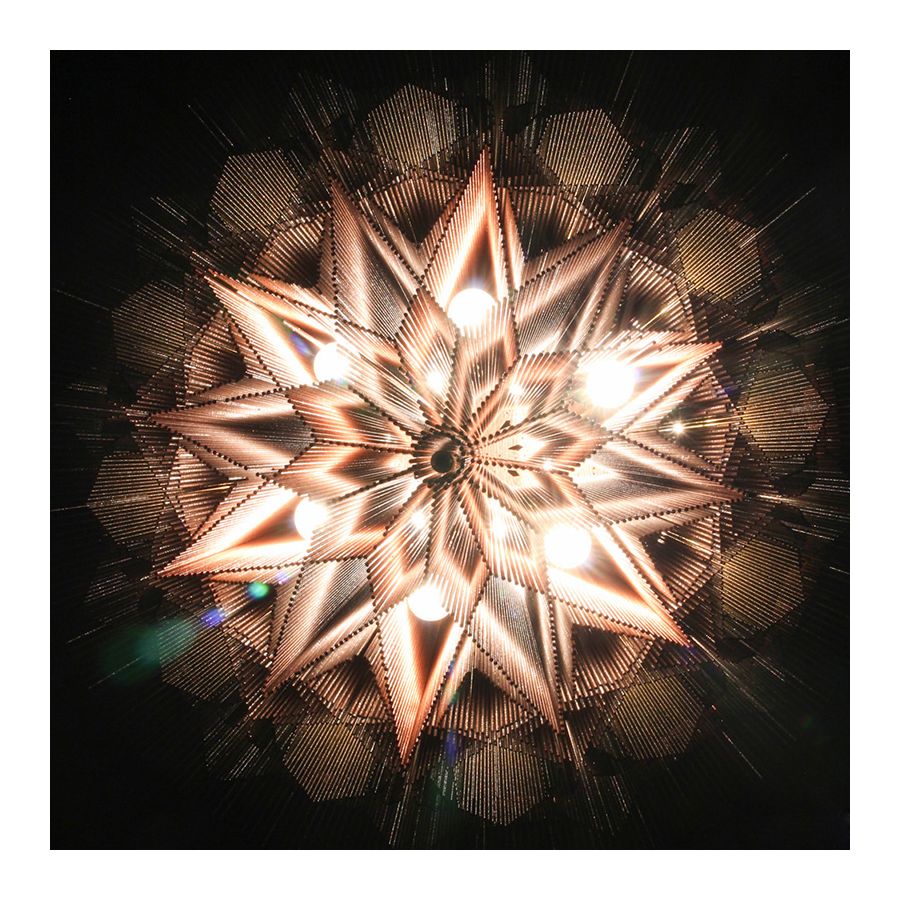 A massive intense Illuminated Mandala sculpture inspired by Islamic patterns which have been translated into three dimensions through the extrusion of the complex interlocking geometry. Illuminated by suspended G4 Halogenor LED lamps.