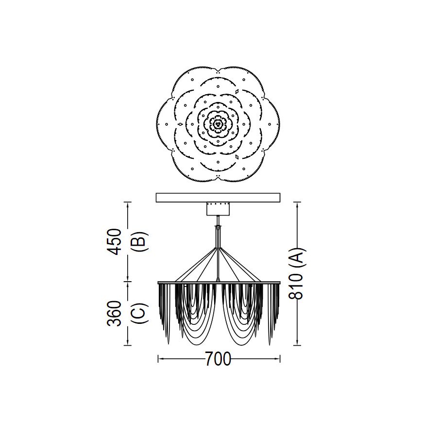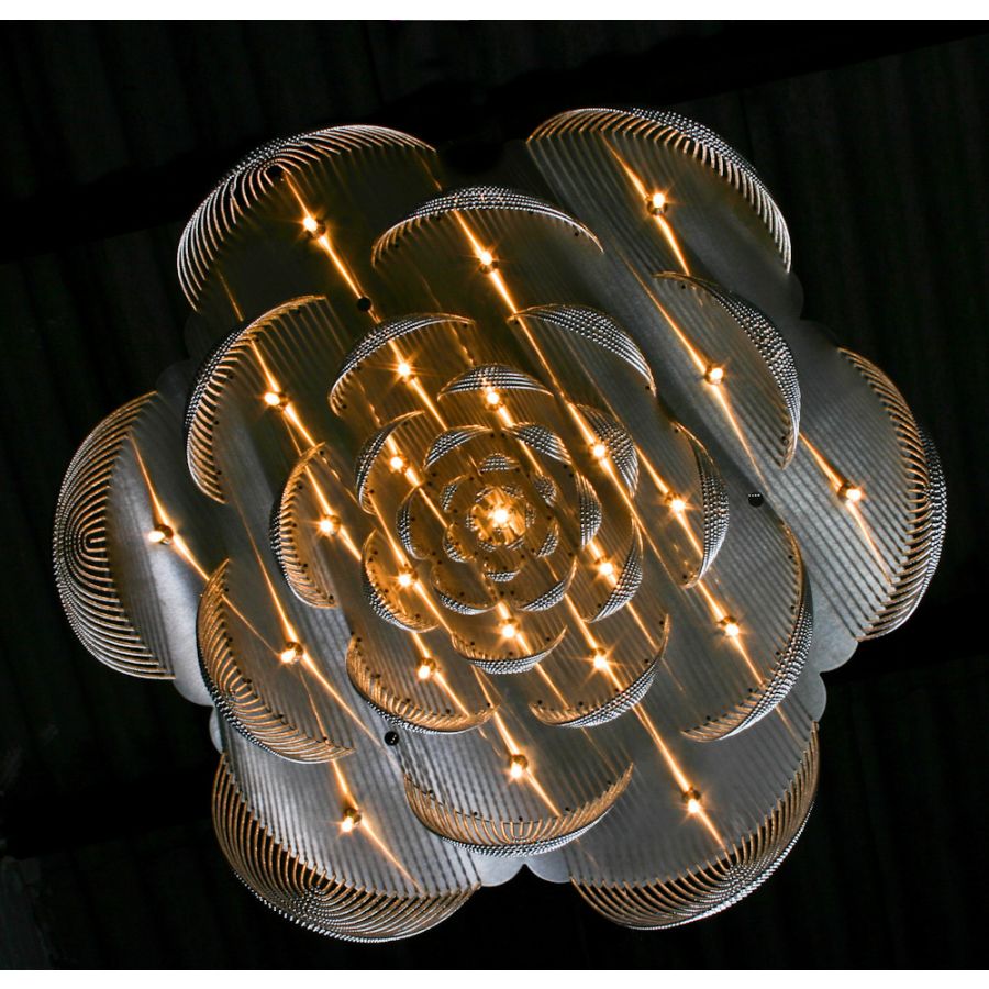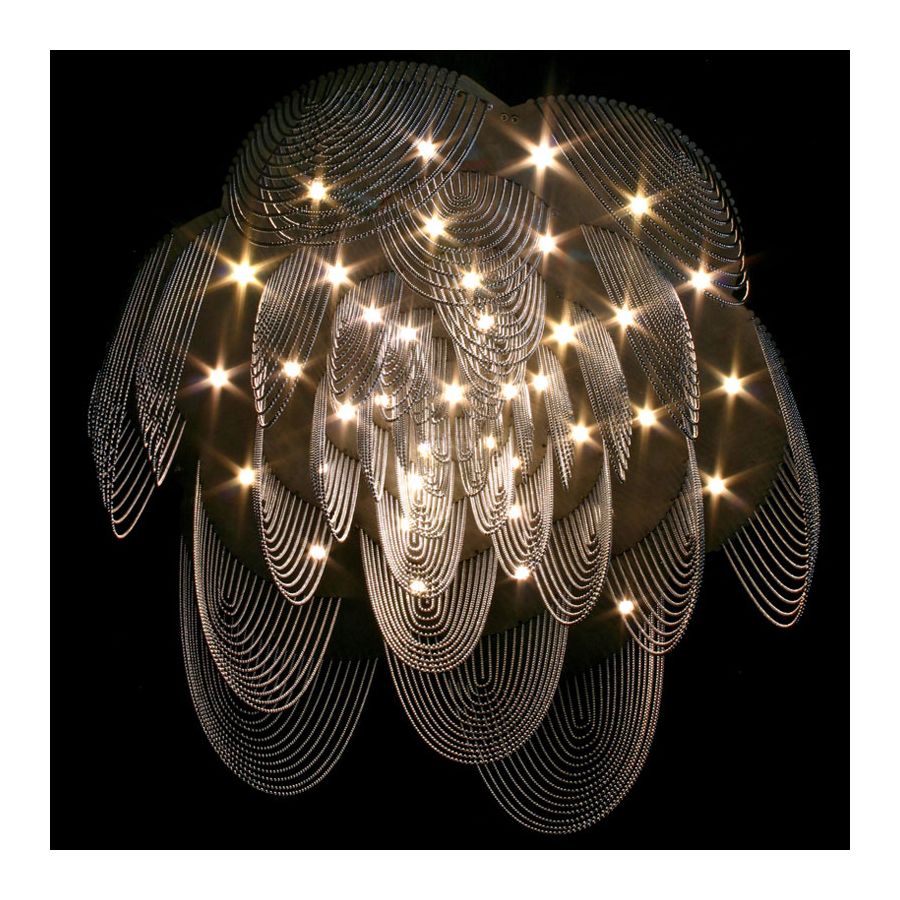 A suspended Hi-Tech plate chandelier with chain curtains as `petals` arranged in a layered formation in the shape of a Rose. Available in two optional styles `straight` or `looped`. Available in G4-Halogen or LED