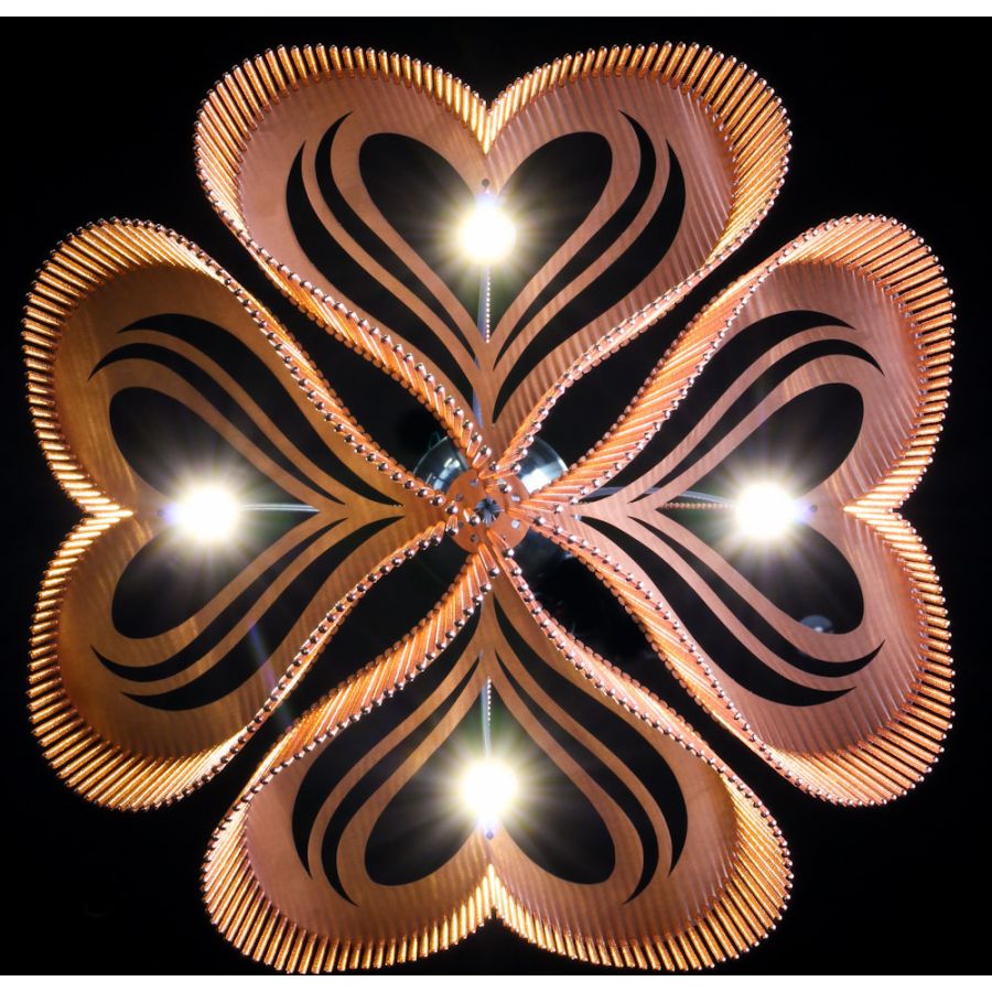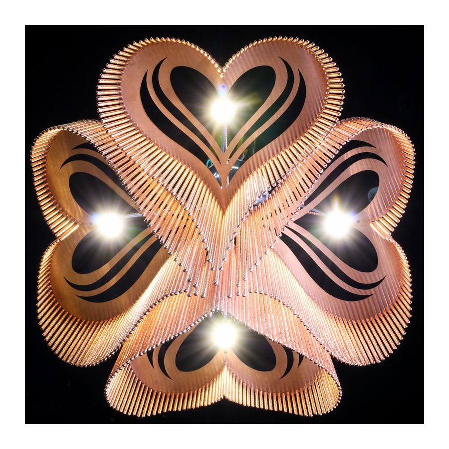 A miniature four leaf clover design translated into a voluptuous and sensual heart shaped form. Illuminated by a single G4 LED 3W lamp within a Pyrex glass ball.