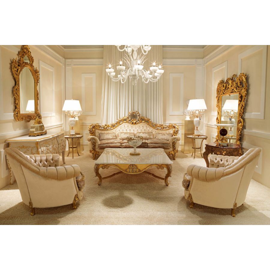 Classic living room upholstered and covered in fabric embellished with an elegant capitonné workmanship. The finely worked lower part represents the unmistakable characteristic of this collection that combines sinuous lines with high quality artisan finishes. These characteristics make the furniture of this collection timeless, classics forever.