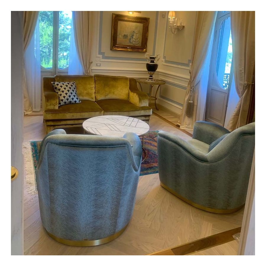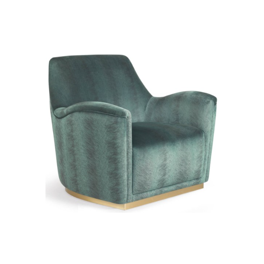 Elegant armchair with satin-finished brass base. The modern design with simple lines complemented by the refinement of the finish allows it to fit harmoniously into various interiors.