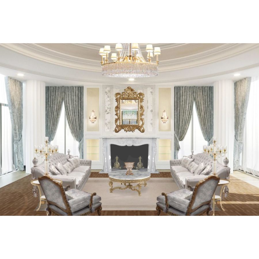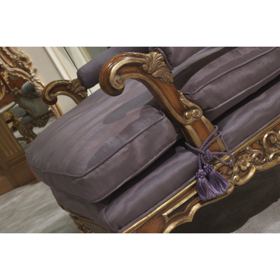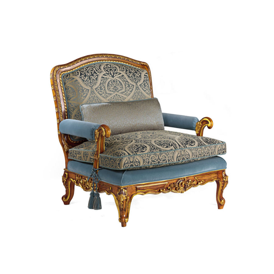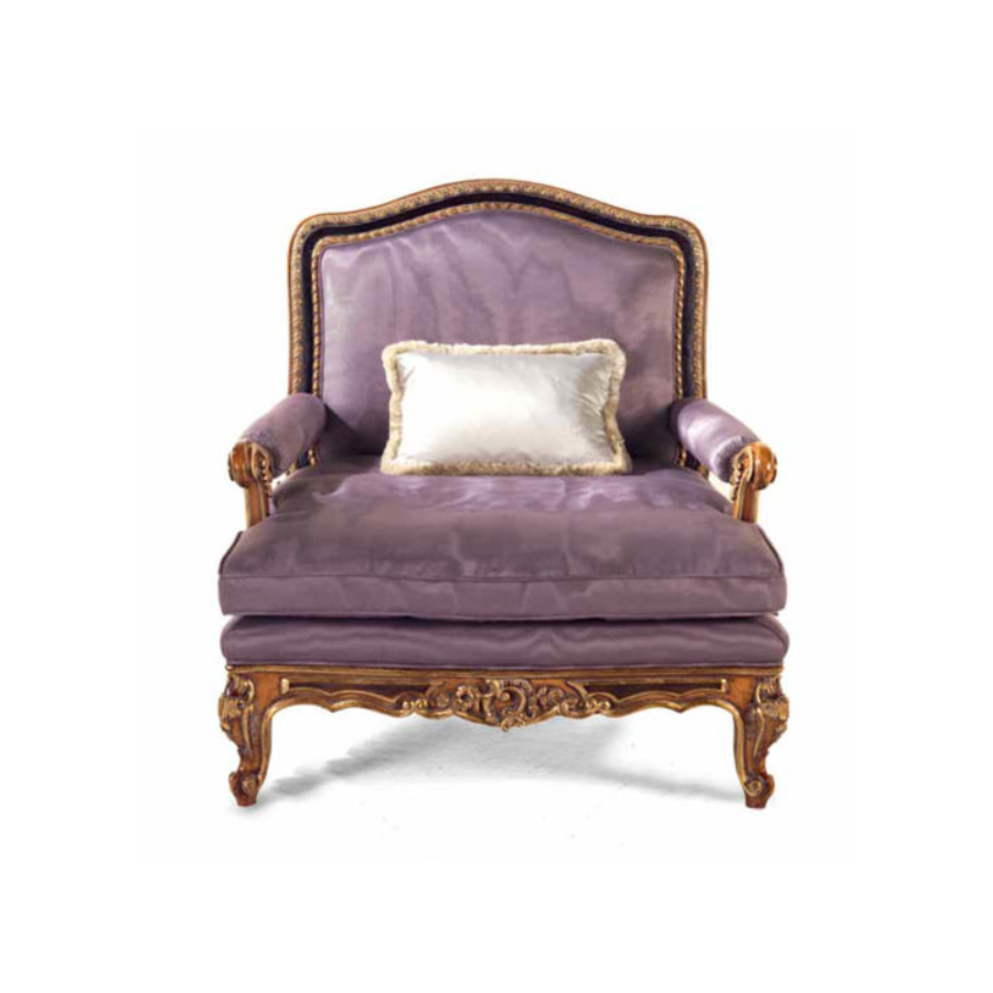 Wooden armchair with carvings and gold-colored details in classic style with internal backrest, seat cushions and decorative pads.