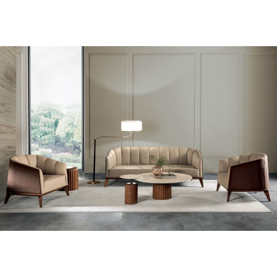 Sophisticated modern style living room composed of a sofa and armchair with a young and dynamic character. ROY is a seating system finished with fine materials based on ancient artisan techniques handed down over the years from generation to generation.