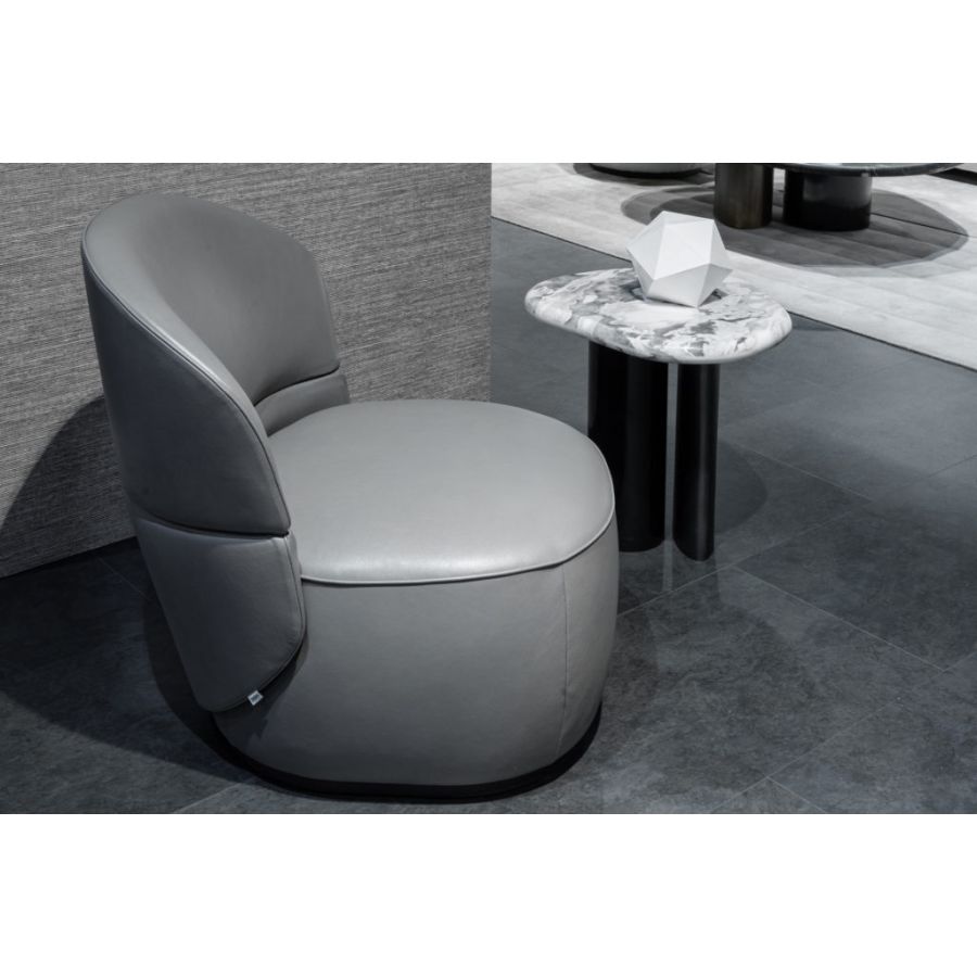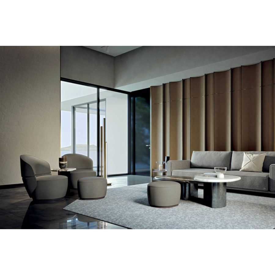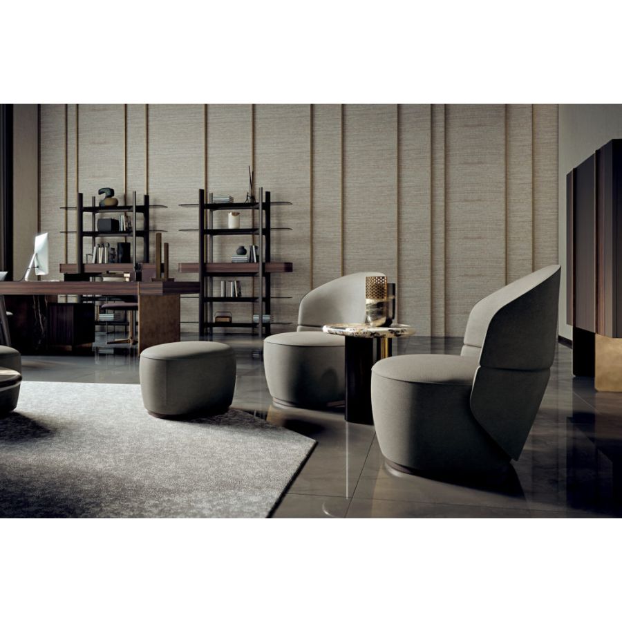 Modern style armchair and pouf with a base in grey stained ash. Their minimal and functional design fully expresses the values of the NEXT furnishing accessories collection by Studio CASTELLO LAGRAVINESE.