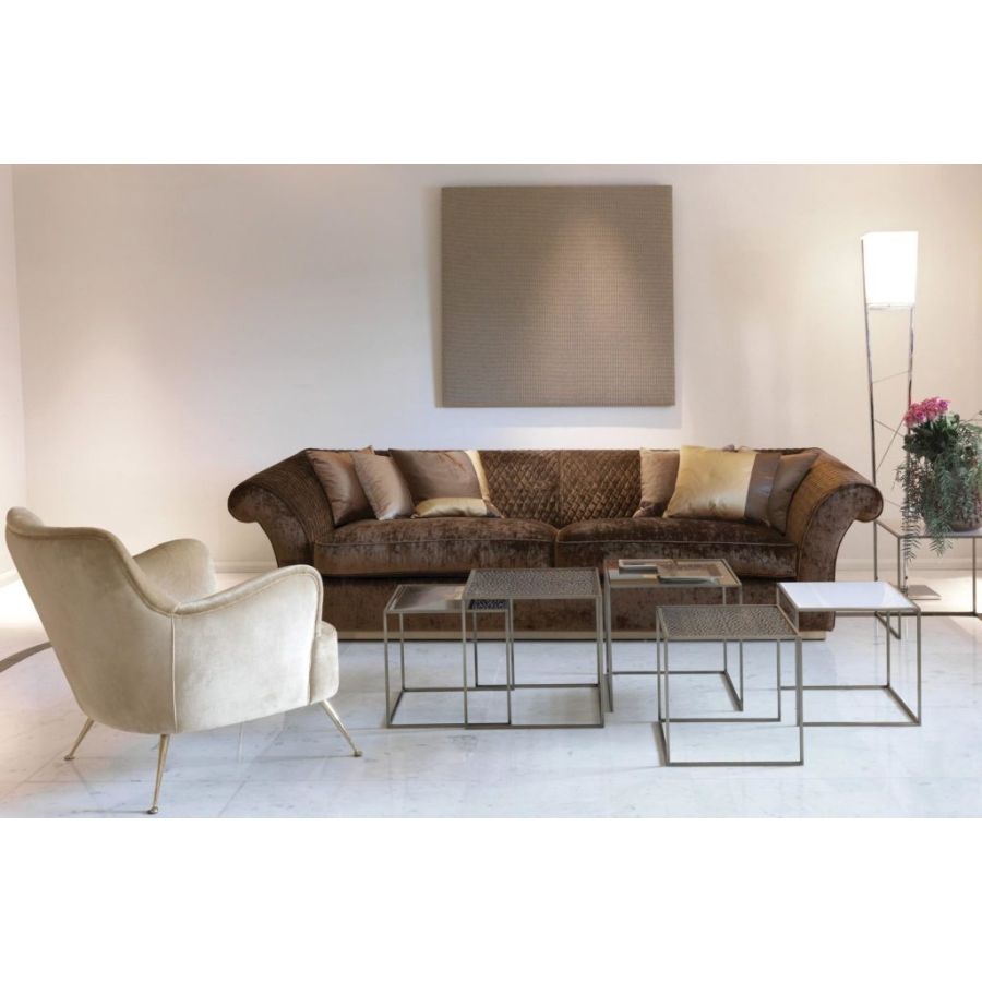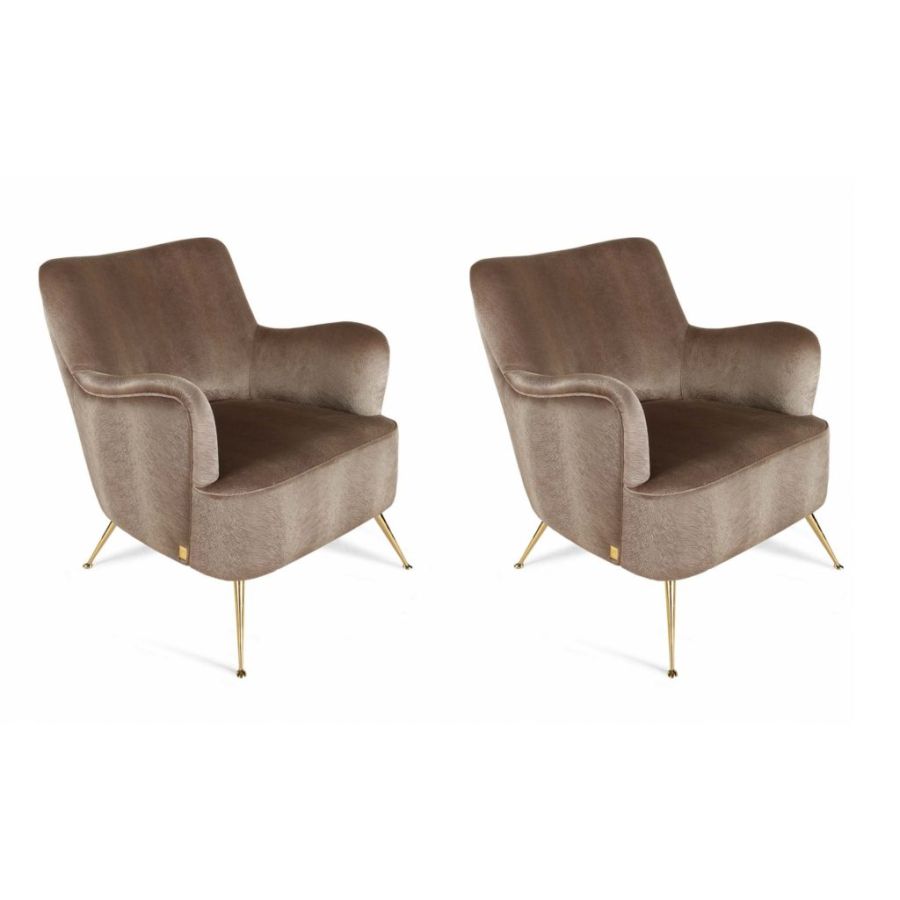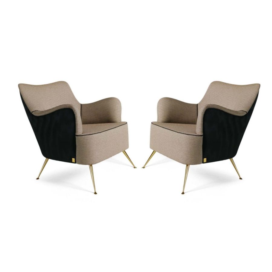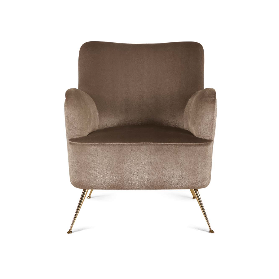 Armchair with an iconic and contemporary design with metal feet and gold finish. The elegance of its lines allows it to live in harmony in different environments and contexts.