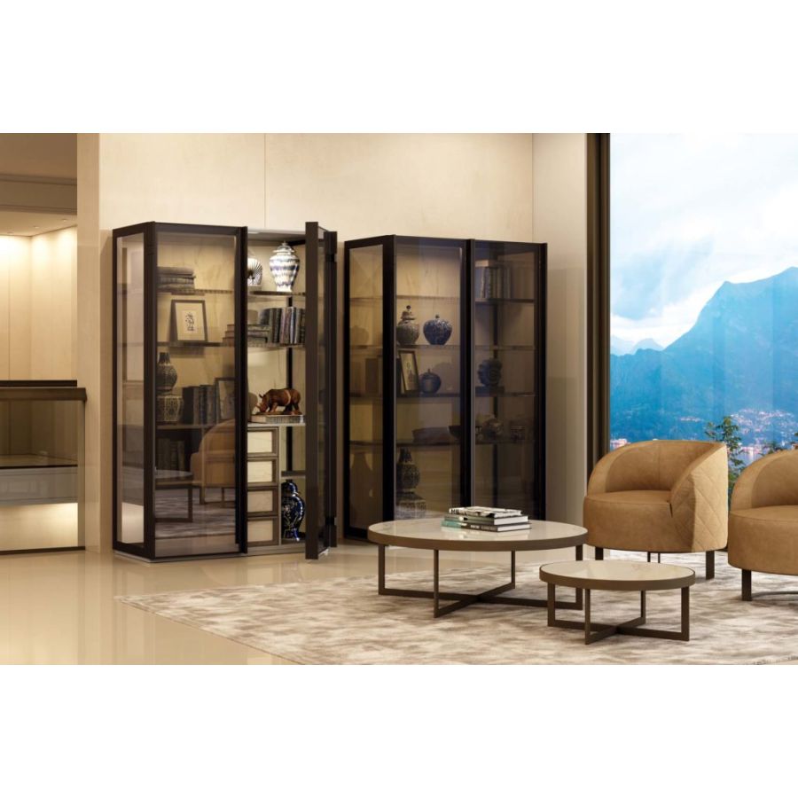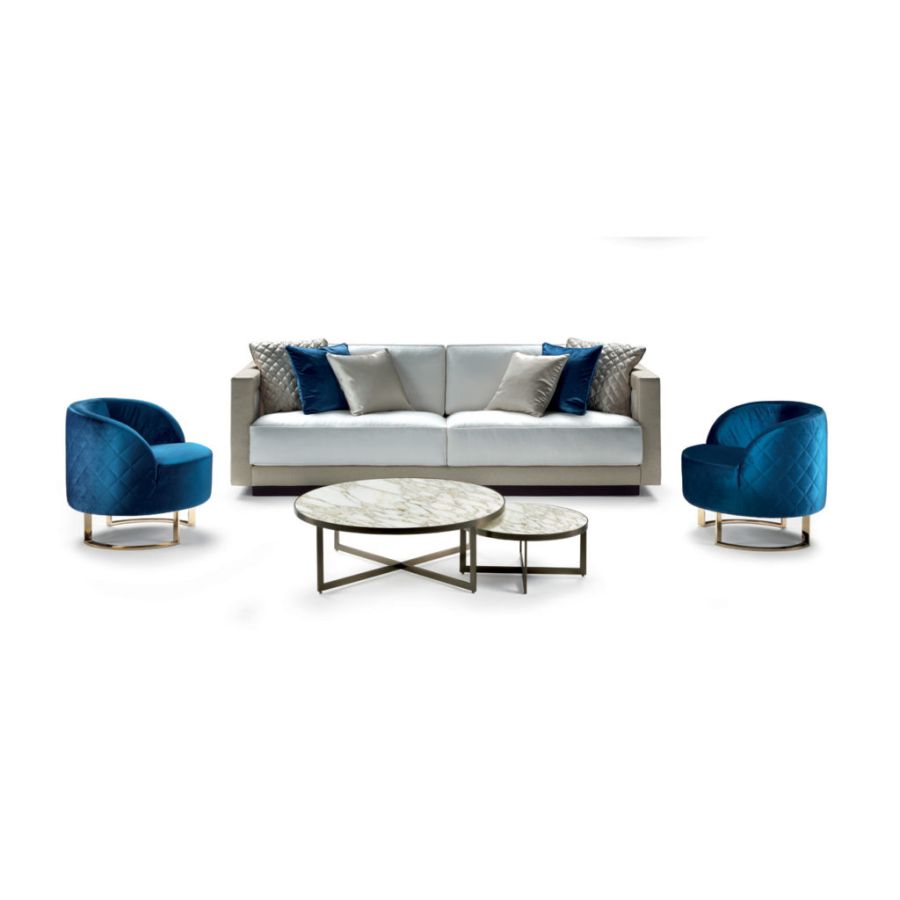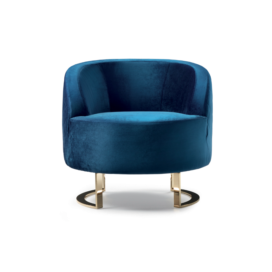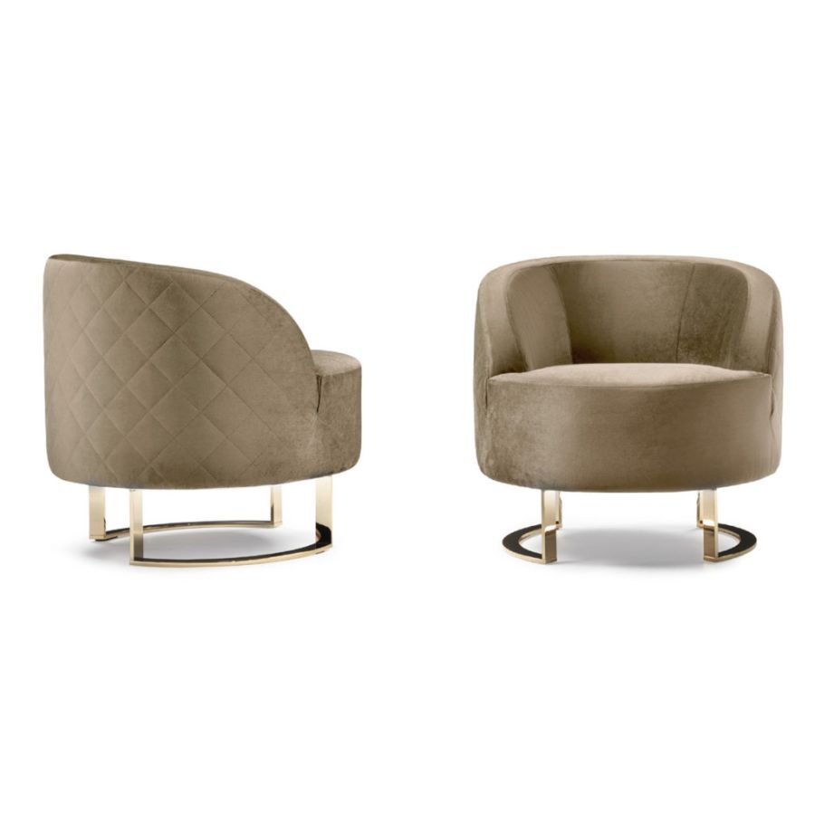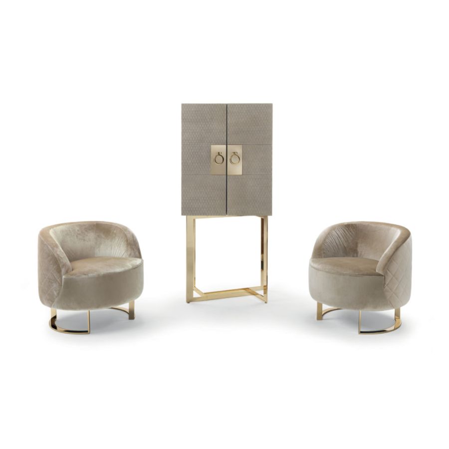 CALLA is a particular and enveloping modern armchair. The rounded shape of this armchair and its precious Champagne finishings give it a glamorous look suitable for a modern, contemporary living room or a bedroom. This armchair, with its refined character, fills every room with charm and elegance.
