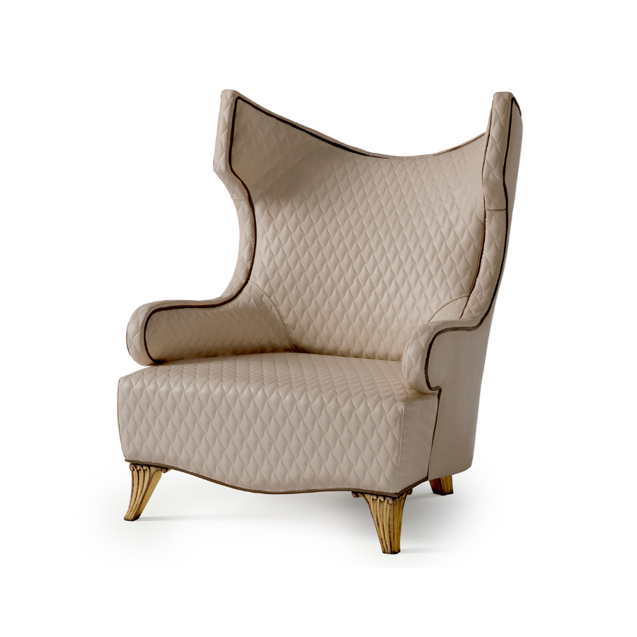 Sophisticated bergere armchair with extremely evocative lines. The seat is comfortable and spacious, the upholstery is available in a wide range of ZANABONI fabrics and leathers.