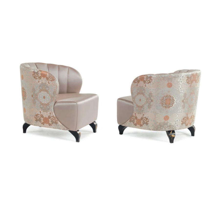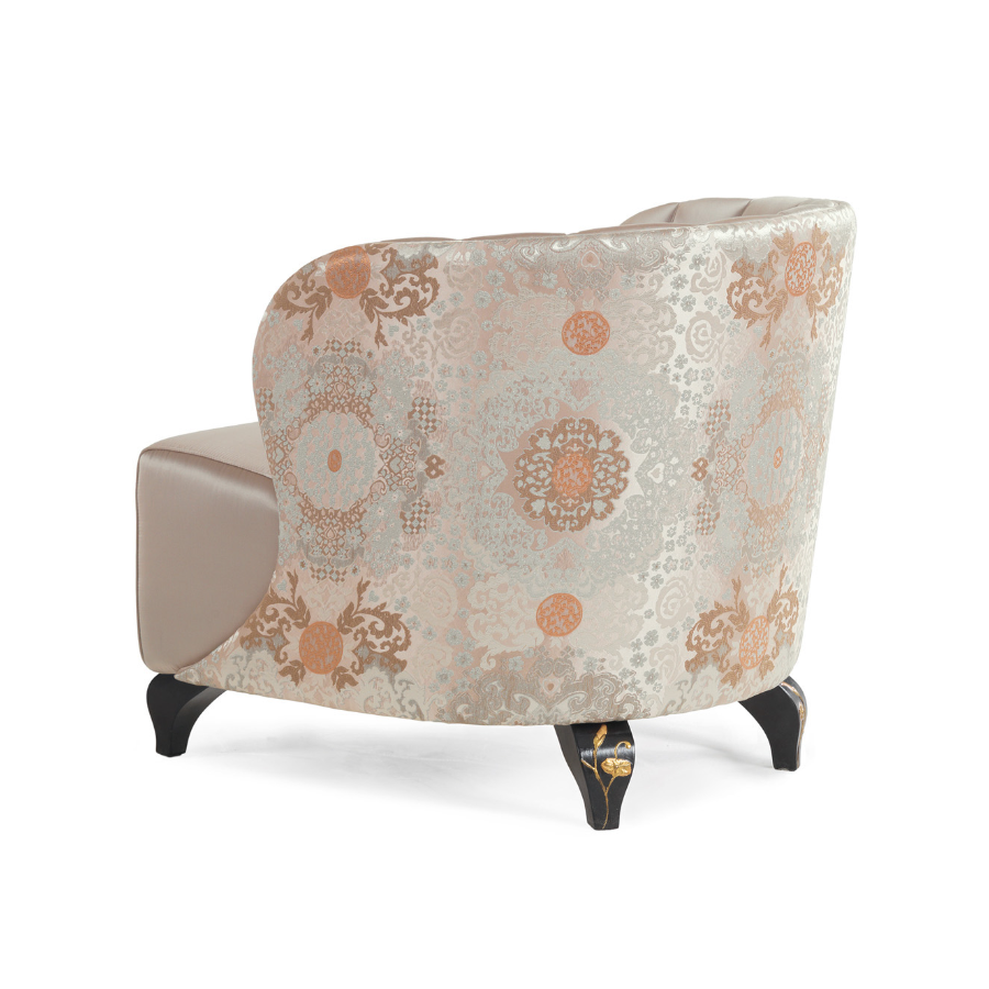 The CELINE armchair is a magnificent complement to an entrance, a bedroom or a living room. A piece of artistic craftsmanship that thanks to its splendid decorations on the armrests and backrest, can also be placed in the center of the room and live as a protagonist.
