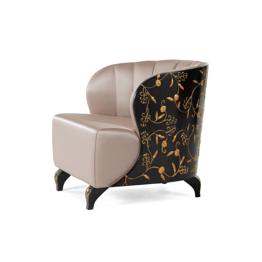 The elegant structure of this armchair is characterised by handcrafted decorations also on the feet.