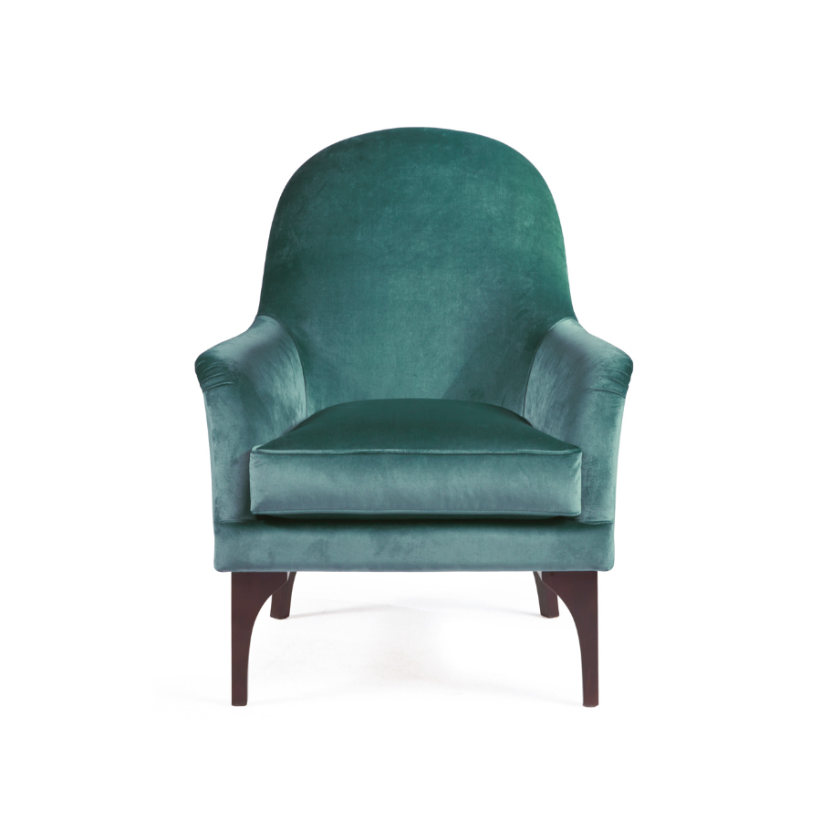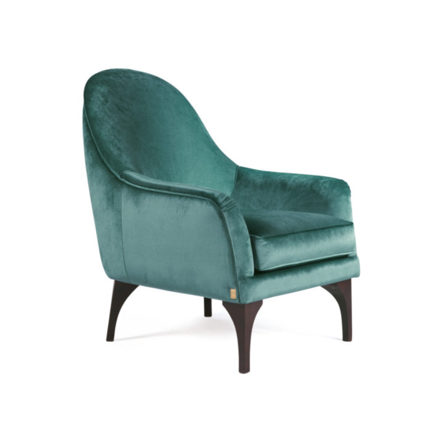 Elegant armchair with a contemporary design with delicate and sophisticated curves. Its solid wood structure features hypoallergenic polyurethane padding and a goose down cushion.
