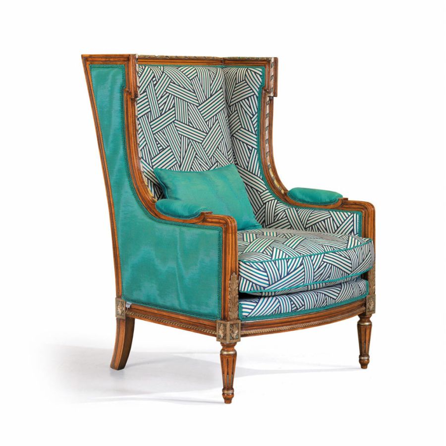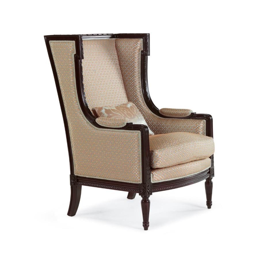 Classic armchair handcrafted with high back, wooden frame, fabric upholstery and decorative cushion.