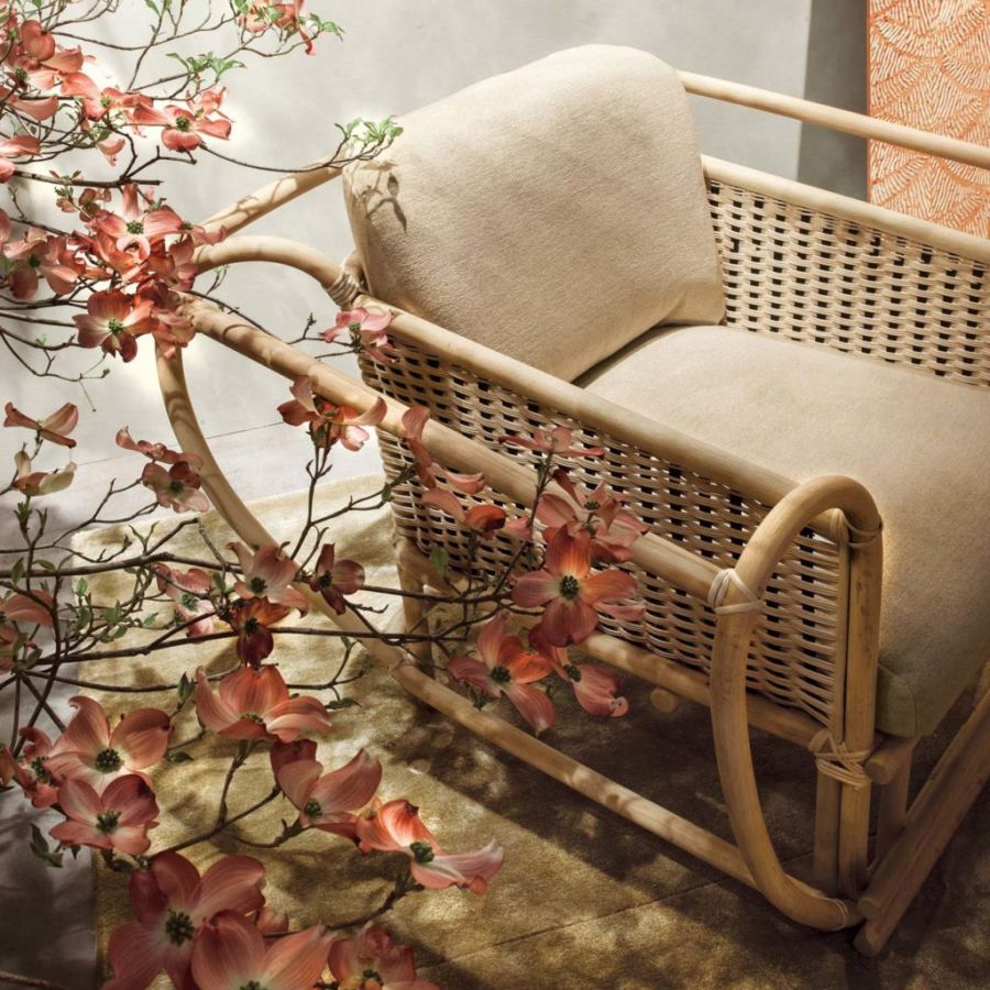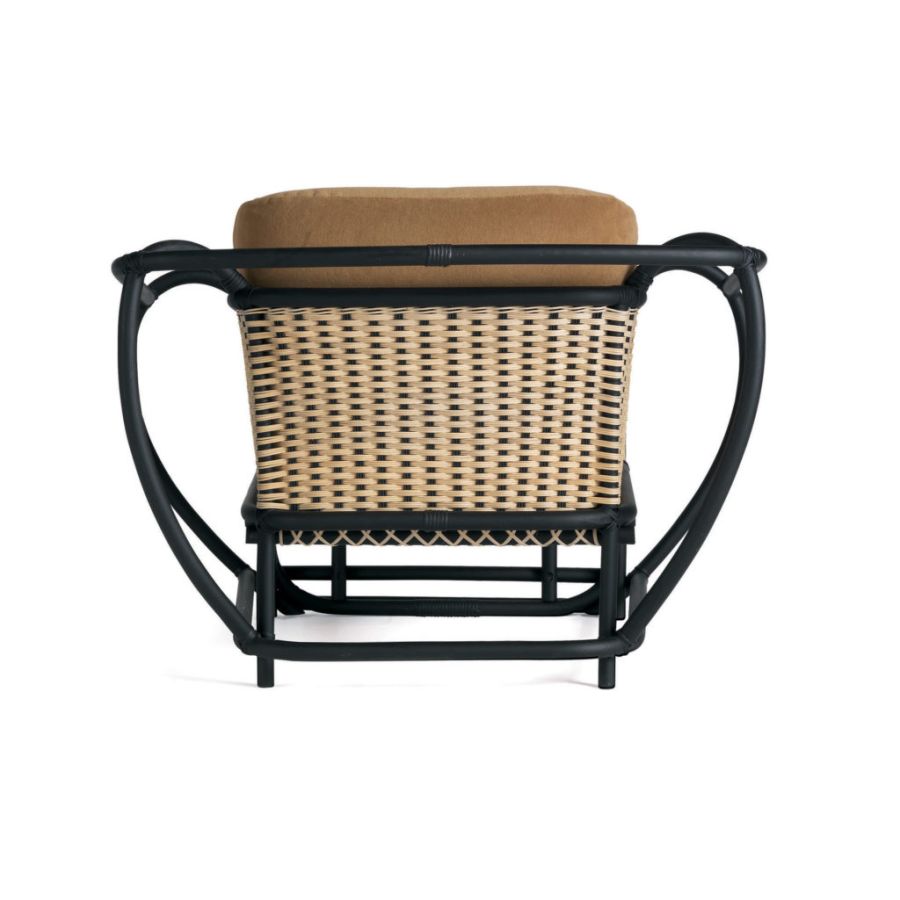 GREEN CHANNEL is a set of modern outdoor-style seats featuring a magnificent natural rattan structure that encloses the comfortable seat in a captivating and sinuous silhouette.