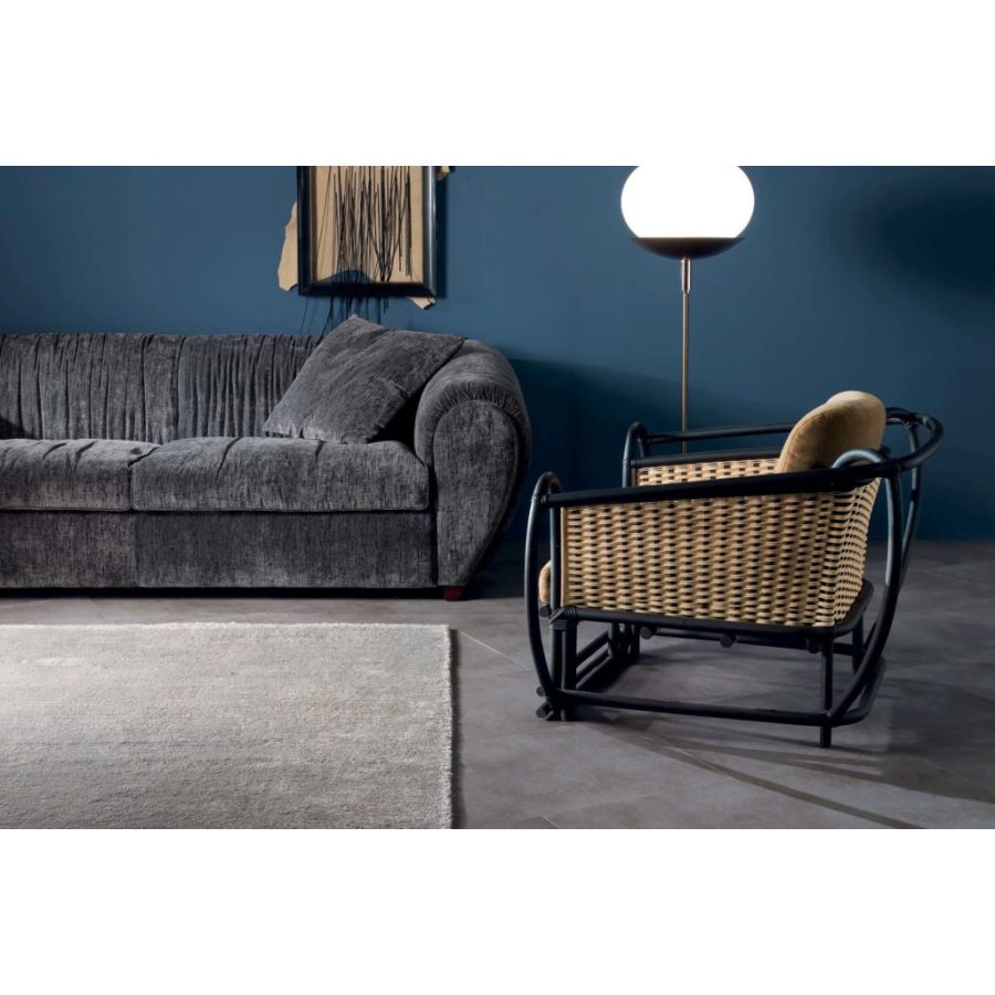 Enriched by a classic rope weave, the seat features two cushions covered in dove-gray fabric. The refinement of its design and the materials used allow this element to coexist in indoor and outdoor settings, enhancing the context.