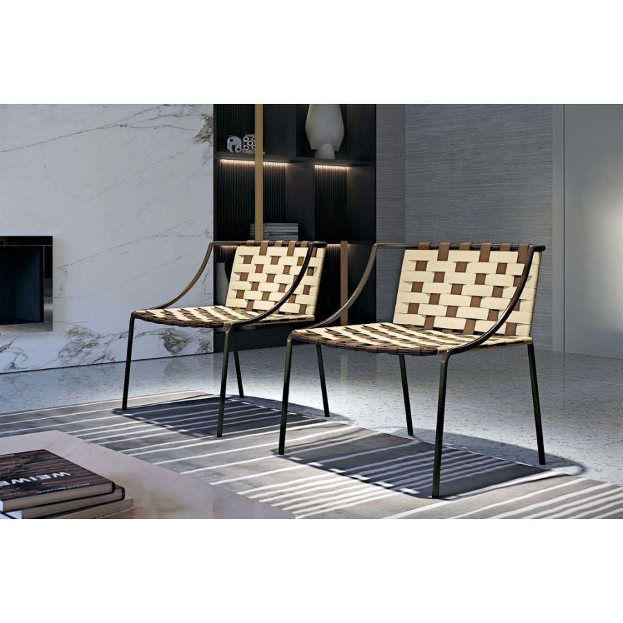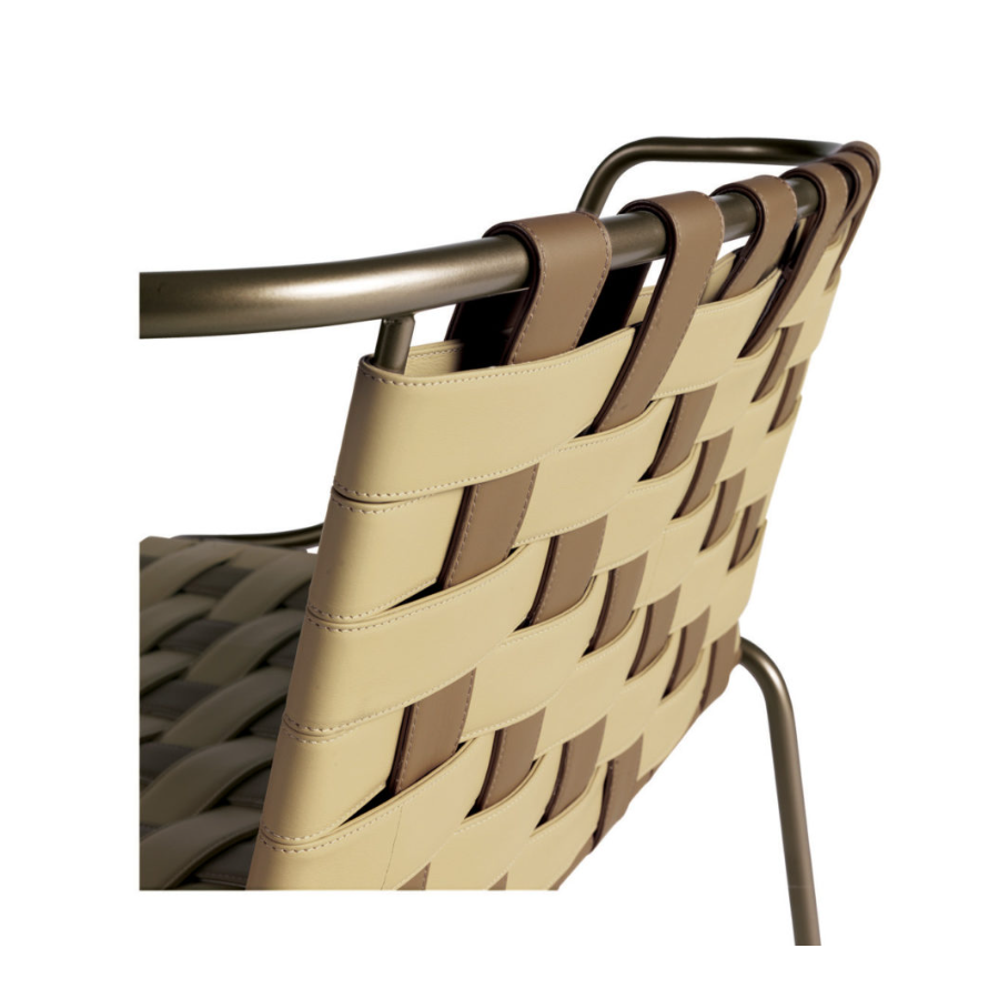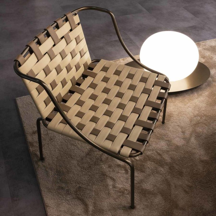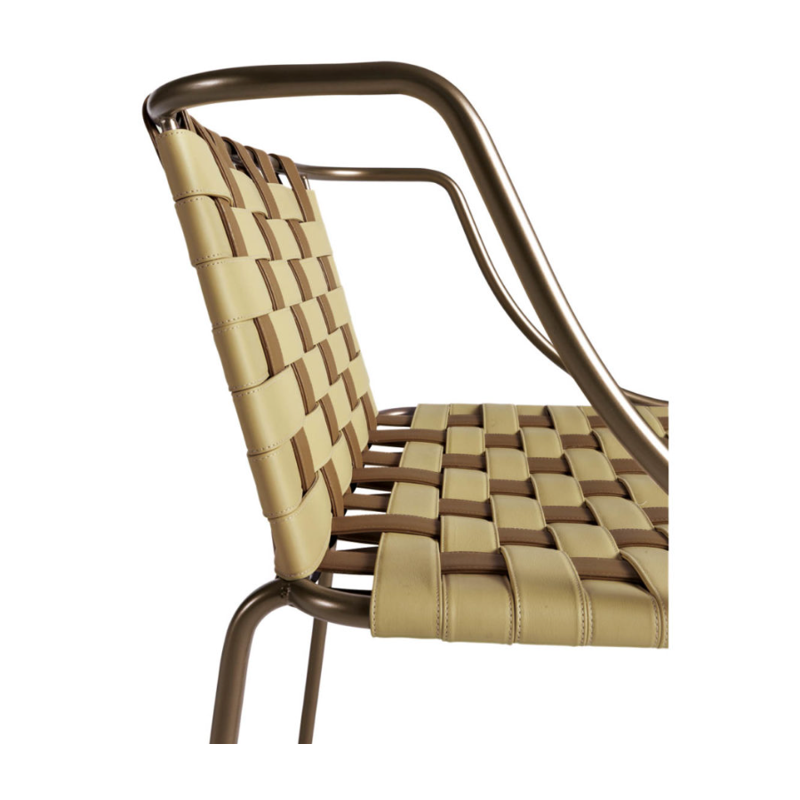 An innovative design of unique refinement, this splendid outdoor-style armchair features a magnificent bronzed metal frame enriched with a classic leather weave. The seat has a particularly comfortable design thanks to the two armrests. This armchair features a splendid leather weave on the seat and backrest that rests on a sinuous and thin metal tubular structure. This piece will be a unique and elegant accent for both the home and office in indoor and outdoor settings.