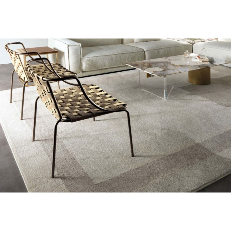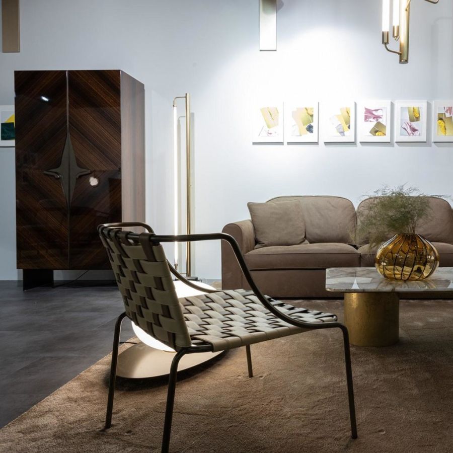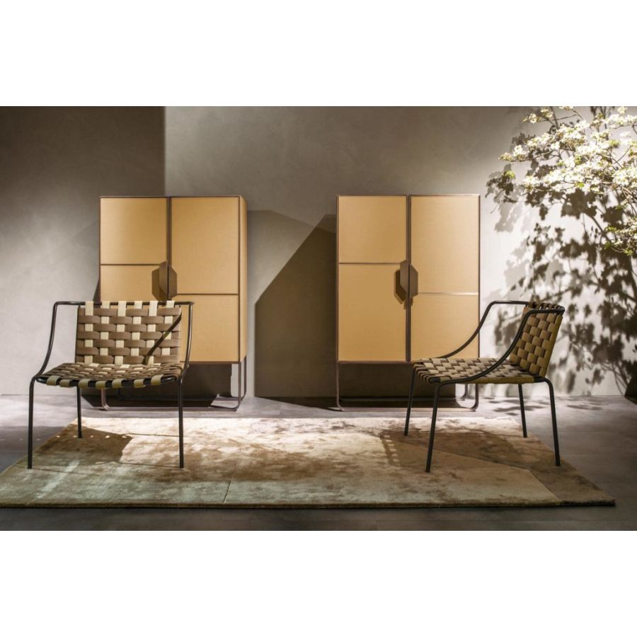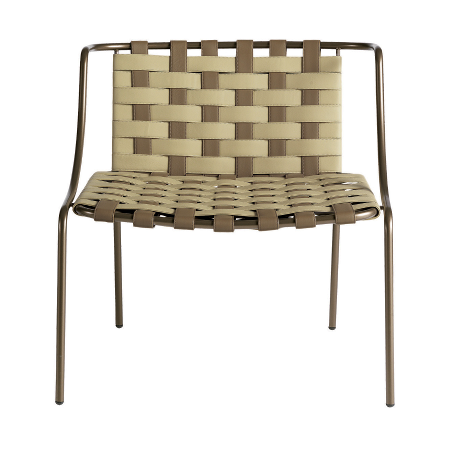 An innovative design of unique refinement, this splendid outdoor-style armchair features a magnificent bronzed metal frame enriched with a classic leather weave. The seat has a particularly comfortable design thanks to the two armrests. This armchair features a splendid leather weave on the seat and backrest that rests on a sinuous and thin metal tubular structure. This piece will be a unique and elegant accent for both the home and office in indoor and outdoor settings.