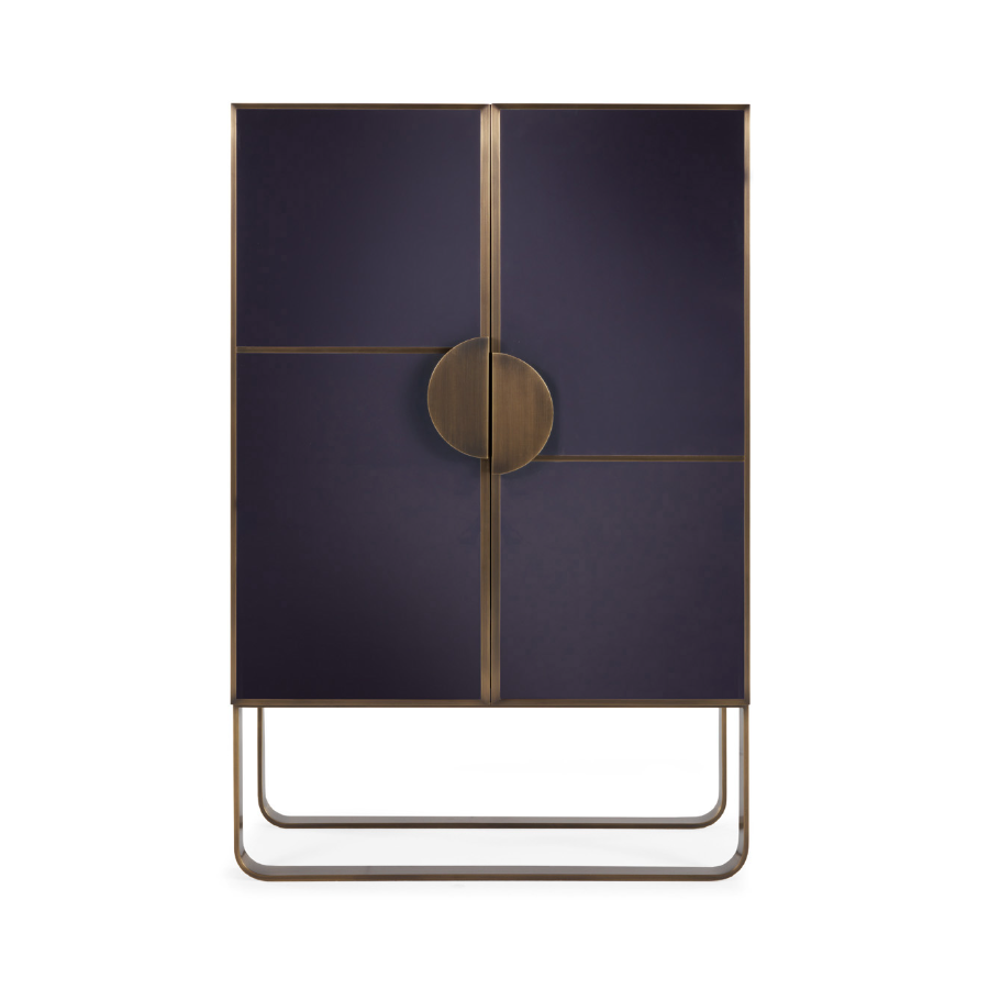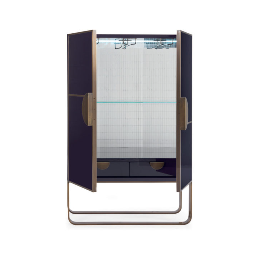 RENDEZ VOUS is a modern bar cabinet with lacquered doors, bronzed metal structure, mirrored interior with drawers, shelf and lighting system. Its style represents a vision: the art of living through furniture and accessories in which design, style, material, create new aesthetic codes.