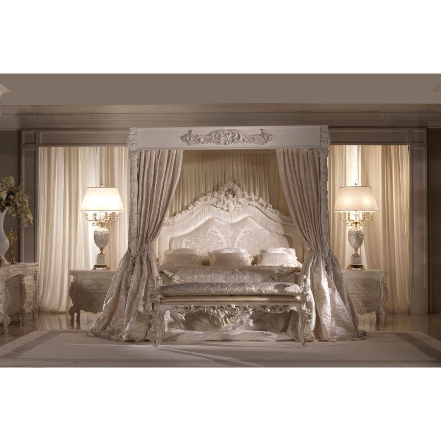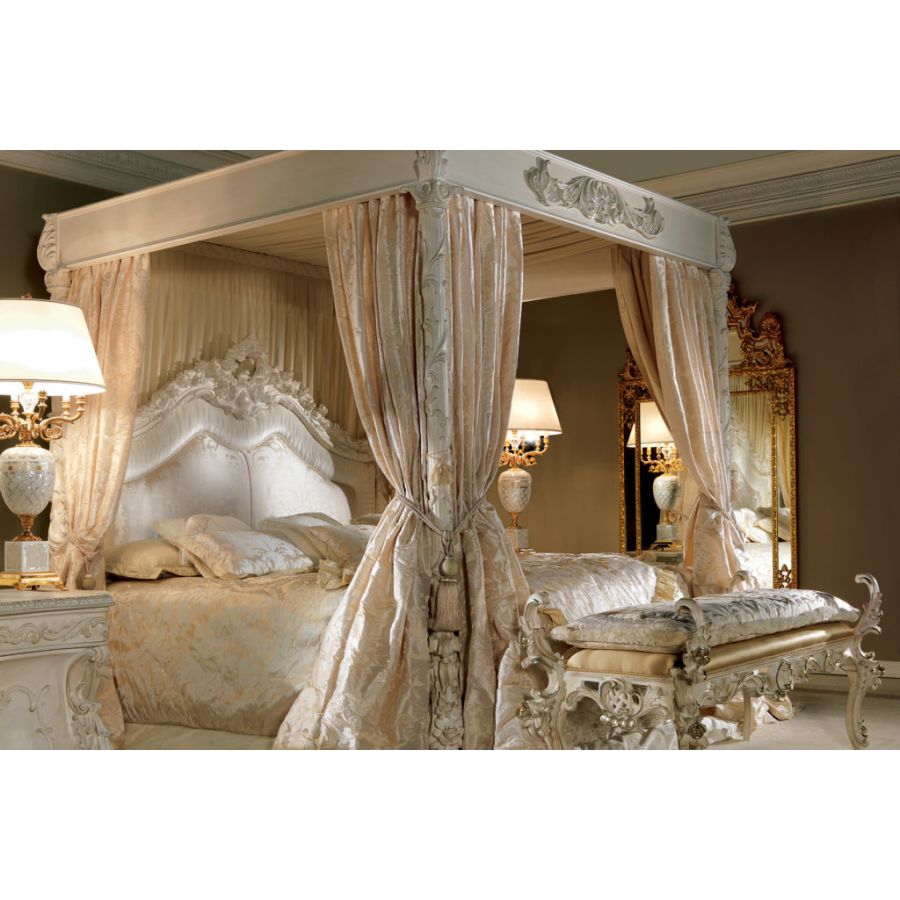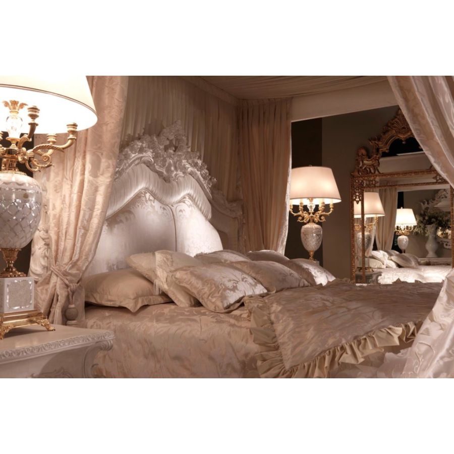 CHARLENE is a baroque-style canopy bed that is part of the ZANABONI classic furniture collection. The curtain that surrounds it is in a refined damask fabric in beige and gold. The headboard features important decorative elements such as curls and carvings.