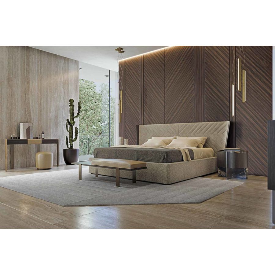 Elegant bed with a sophisticated and versatile design in a modern style characterized by a headboard enriched with geometric embroidery and a covered bed frame. An exclusive model by CASTELLO LAGRAVINESE.