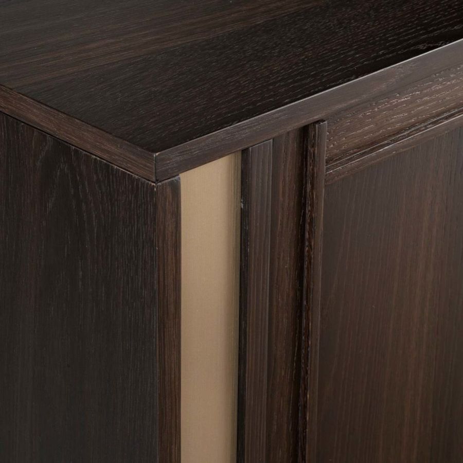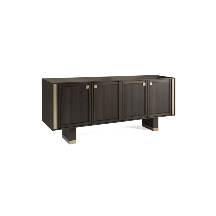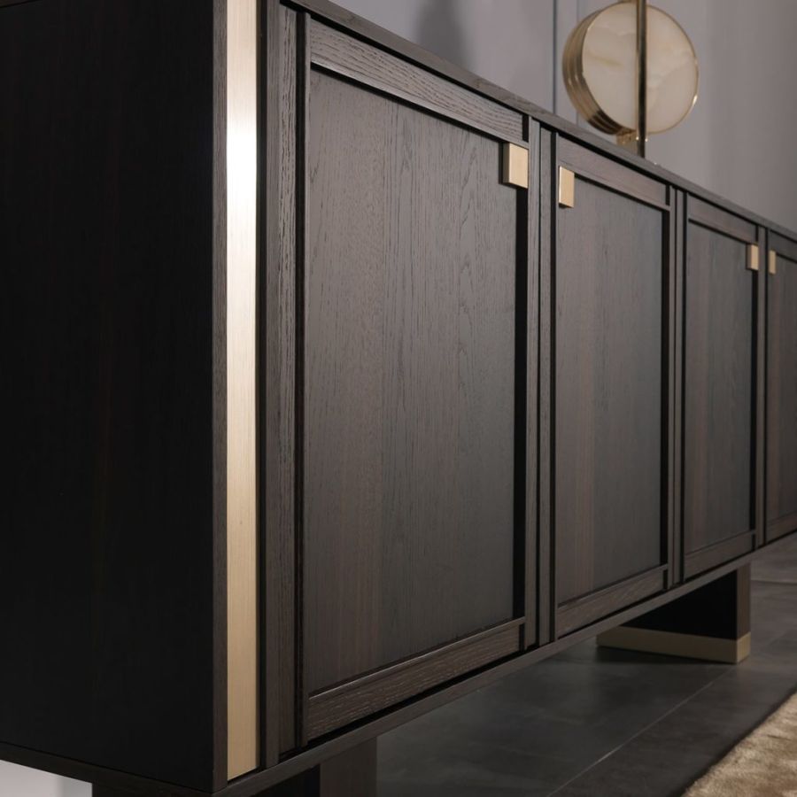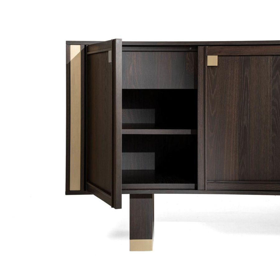 Splendid sideboard In heat-treated oak stained mocha with details in champagne-finish brass. Versatile and elegant, TORTONA is a spacious elegant piece of furniture with hinged doors with a robust, durable and practical appearance. The simple refinement of its design with timeless lines offers a sense of order and beauty. Its large spaces make it a multipurpose piece of furniture in which, thanks to its large compartments, it is possible to store many objects allowing you to ensure a tidy appearance to the entire room.