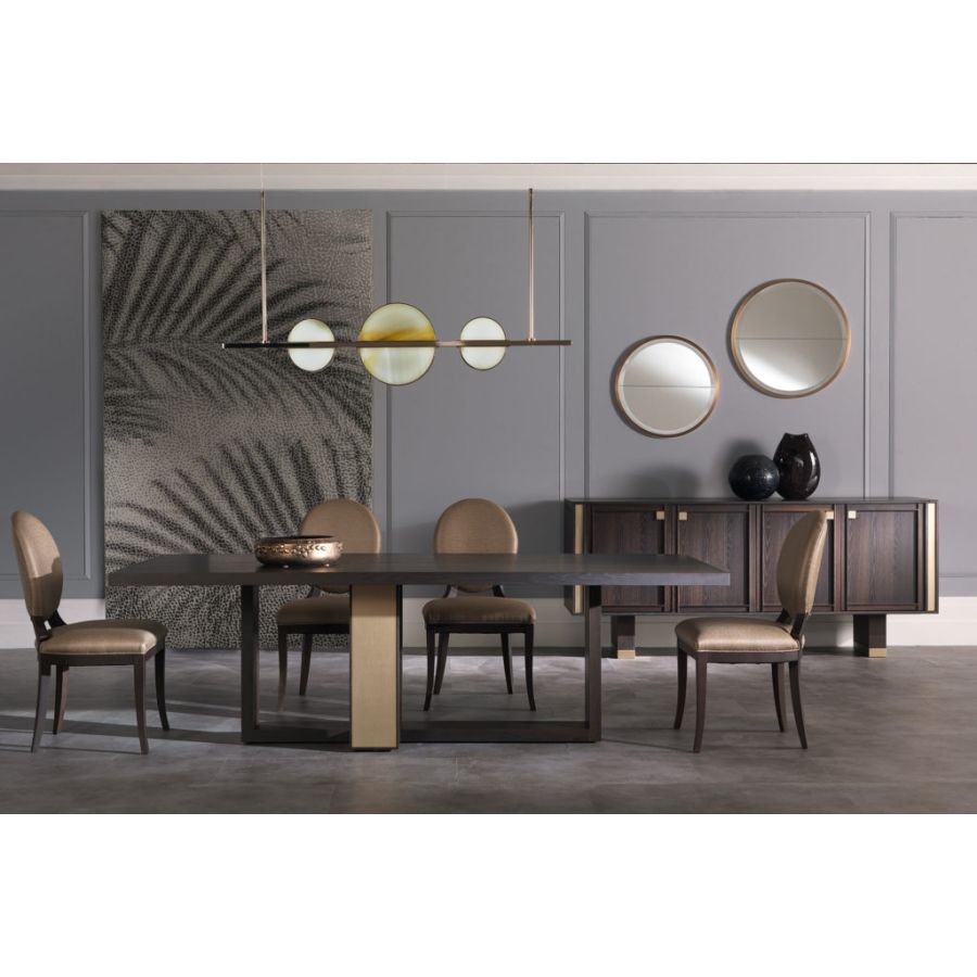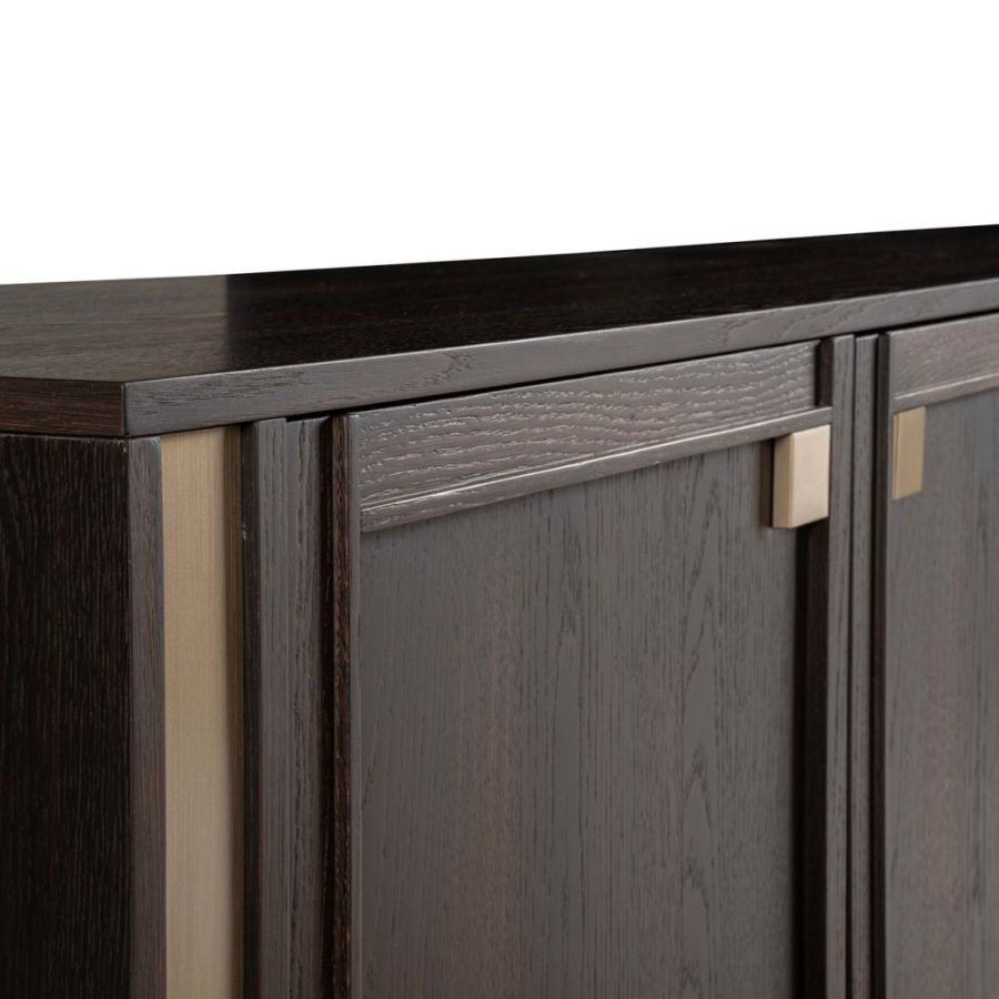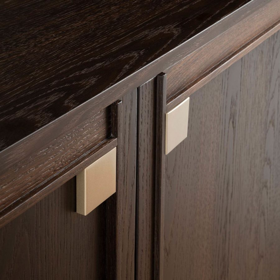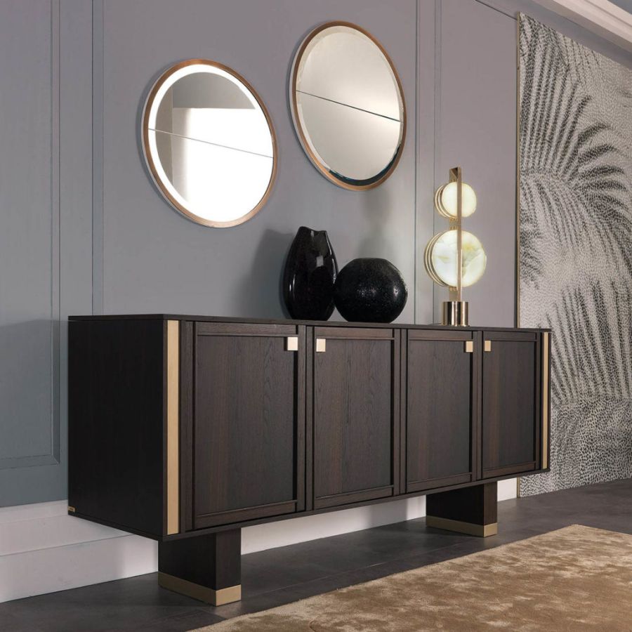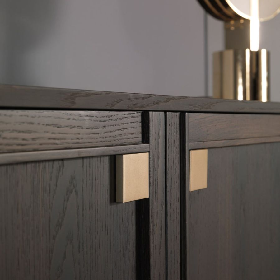 Splendid sideboard In heat-treated oak stained mocha with details in champagne-finish brass. Versatile and elegant, TORTONA is a spacious elegant piece of furniture with hinged doors with a robust, durable and practical appearance. The simple refinement of its design with timeless lines offers a sense of order and beauty. Its large spaces make it a multipurpose piece of furniture in which, thanks to its large compartments, it is possible to store many objects allowing you to ensure a tidy appearance to the entire room.