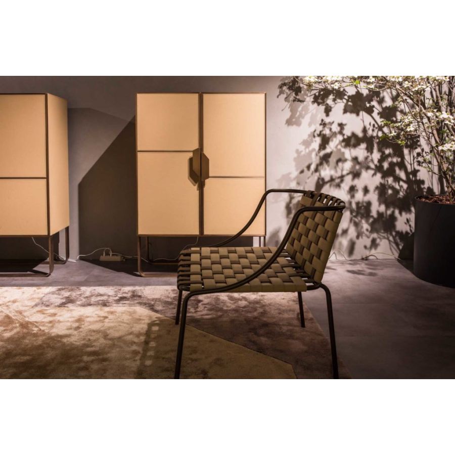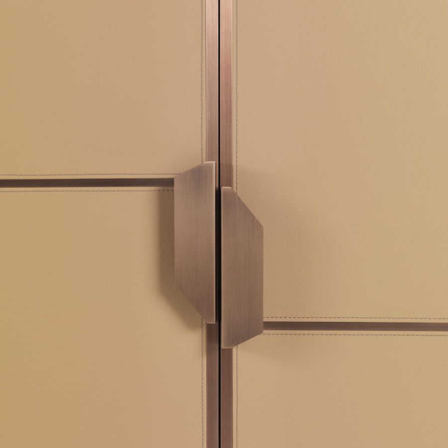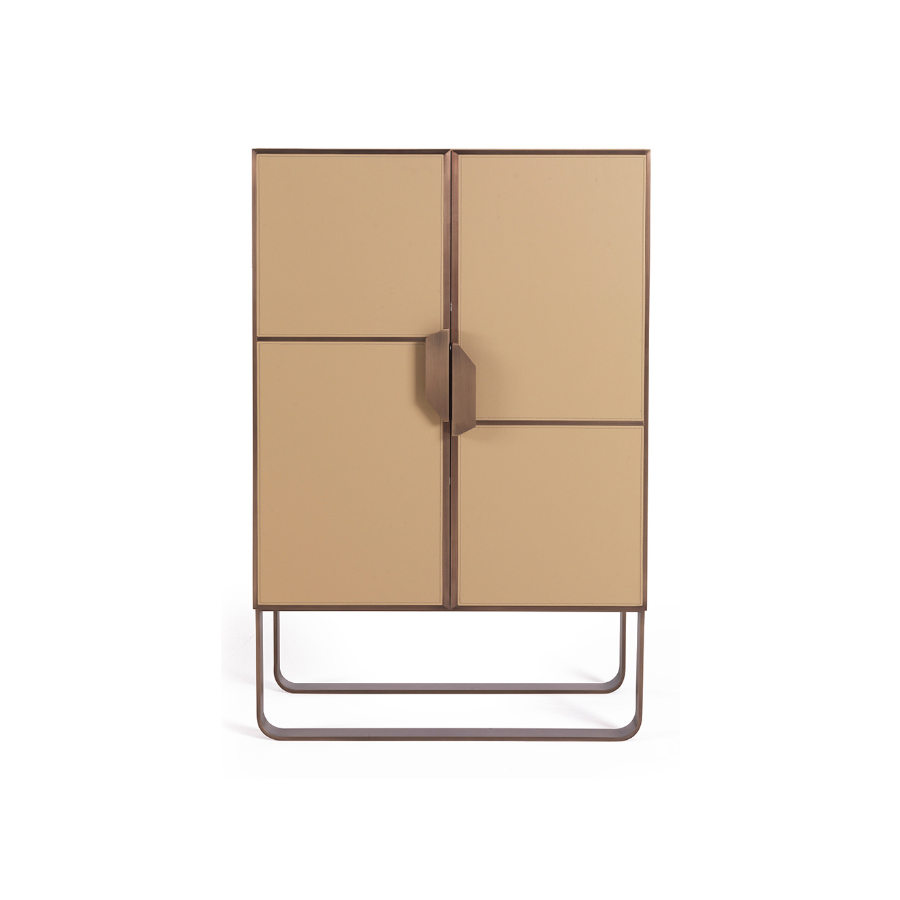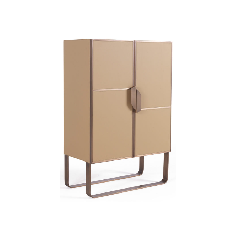 TWIN is a charming modern sideboard with leather-covered doors, brass structure and bronze finish. Its interior is embellished with a mirrored background and lighting system. The interior of TWIN consists of two drawers, shelf and glass holder.
