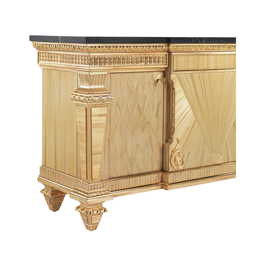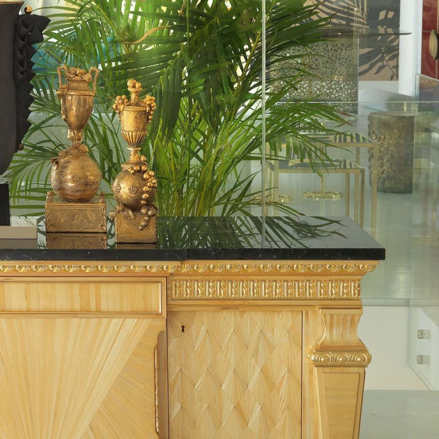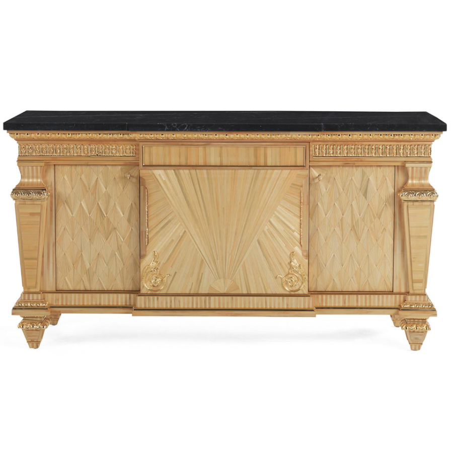 Elegant sideboard inlaid in straw natural finish, with gold-plated brass elements and marble top. This is a beautiful piece of furniture dressed with combinations of absolute elegance to which the craftsmanship gives a unique and personal touch.