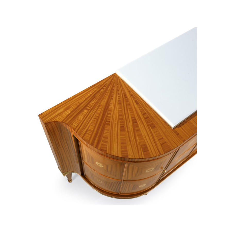 Superb sideboard with an exclusive design with a marble top, inlaid in Citronnier enriched with sophisticated bone details and bronzed brass elements. W045 is a day container adorned with combinations of absolute elegance. Its craftsmanship according to the Brianza tradition gives this piece of furniture a unique and personal touch that makes its beauty timeless and classic forever.