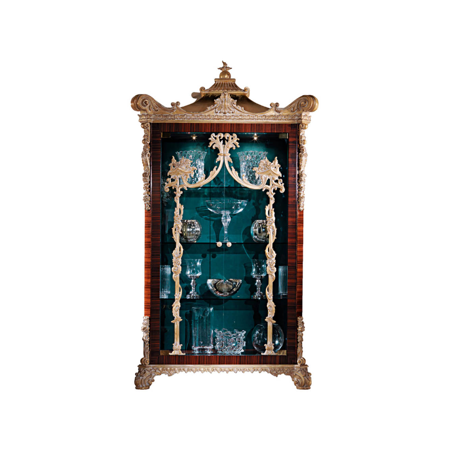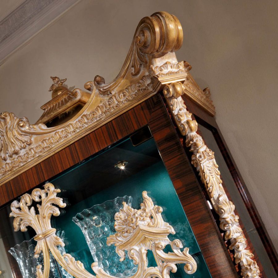 Solid display cabinet in classic style enriched by important decorative details handcrafted. Its beauty is the result of research and tradition, from its style emerges the true spirit of high quality classic furniture, finished with fine materials based on ancient artisan techniques handed down over the years from father to son.
