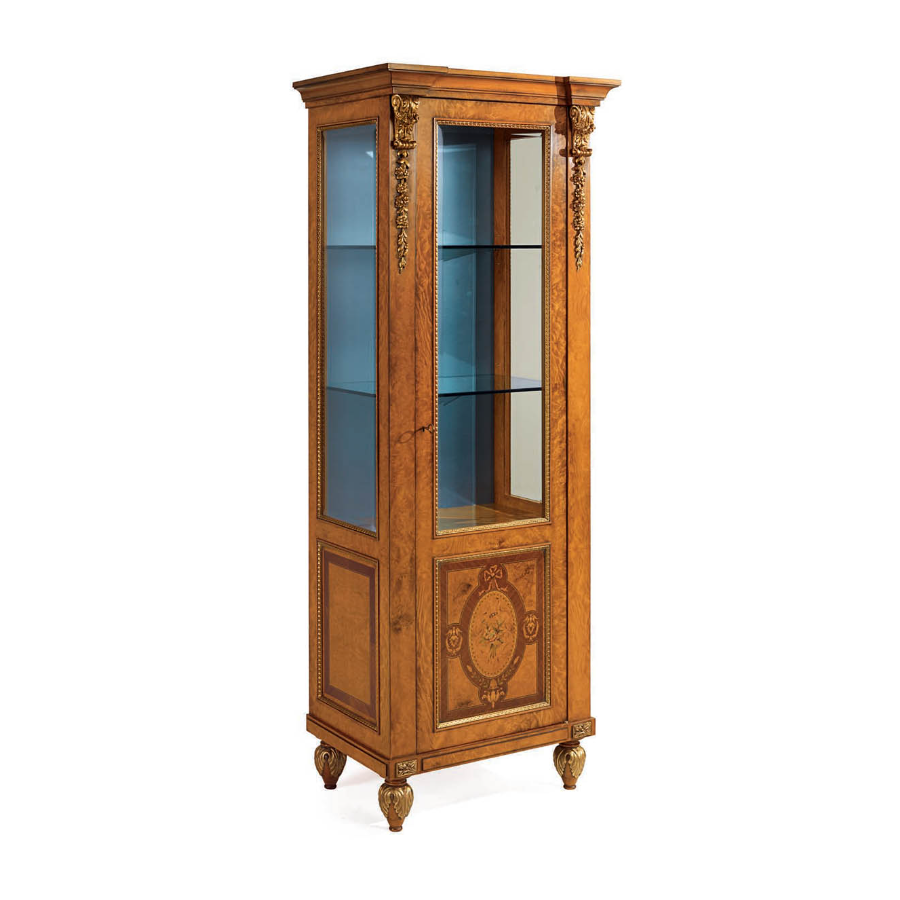 B/4612-S1 is a classic-style display cabinet with a single door complete with internal lighting. Its structure is inlaid with myrtle root and mahogany with mother-of-pearl details. Its handcrafted workmanship according to the Brianza tradition gives this complement a unique and personal touch that makes its beauty timeless and classic forever.