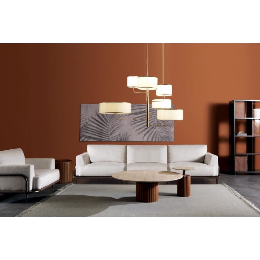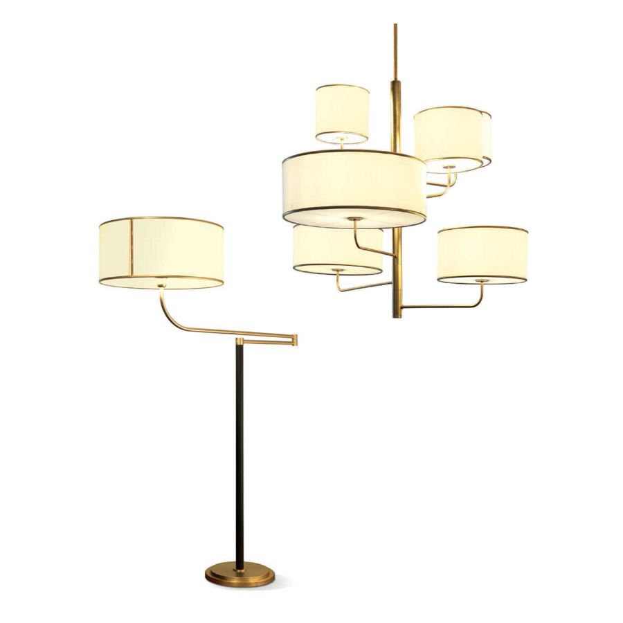 MOVING is an elegant modern style set that consists of a floor lamp and a chandelier with a refined design with leather upholstery and a satin gold finish. Its style represents a vision: the art of living through furniture and accessories in which design, style, and material create new aesthetic codes.