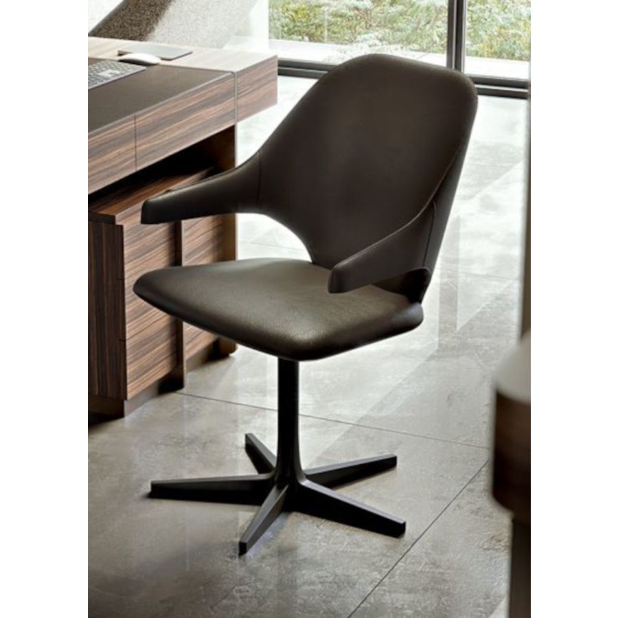 Elegant swivel armchair with brushed black metal frame and formal seat with padded cushion.