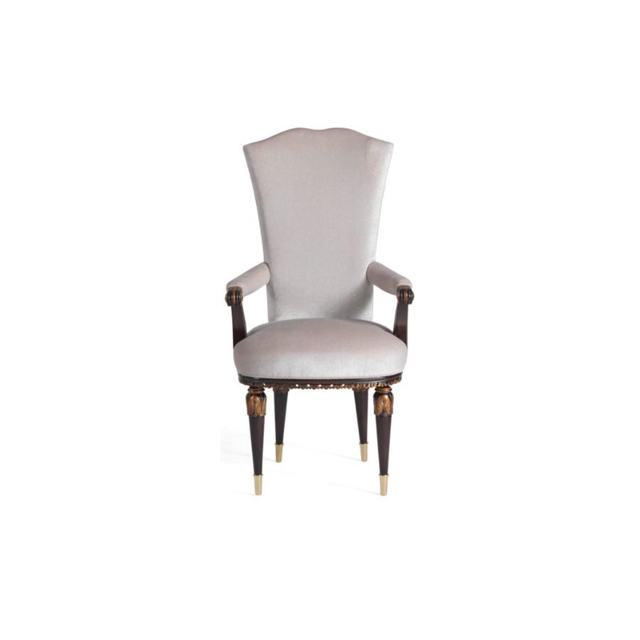 Neoclassical style chair in solid wood with carvings decorated with gold leaf, embellished with delicate metal pins on the legs, available in the version with armrests P/4600 and without armrests S/4600.