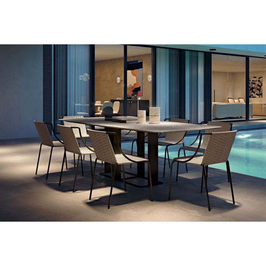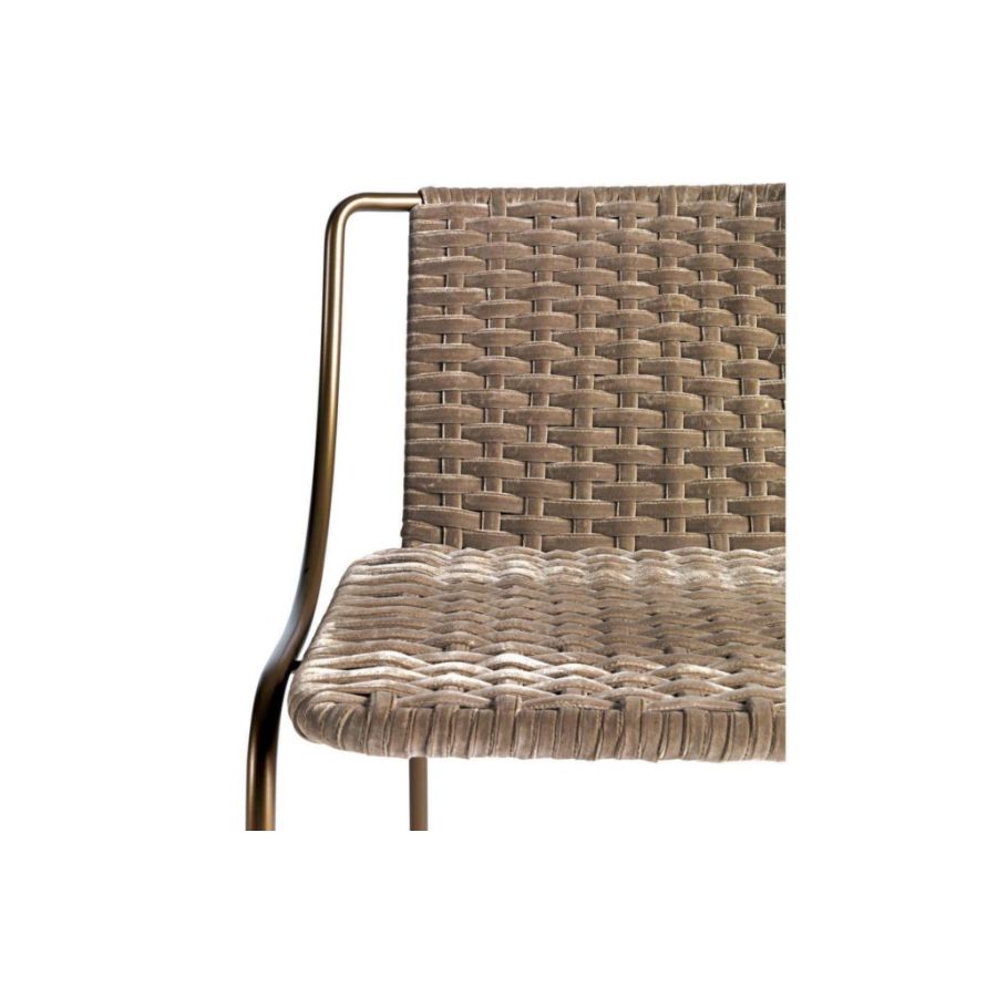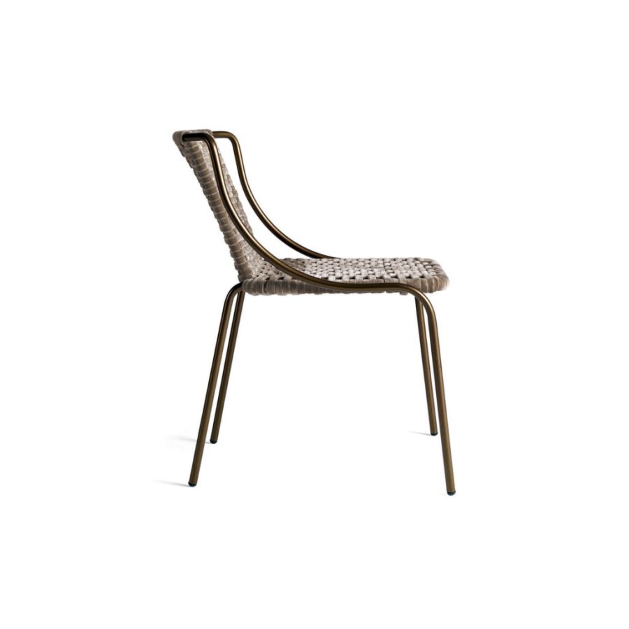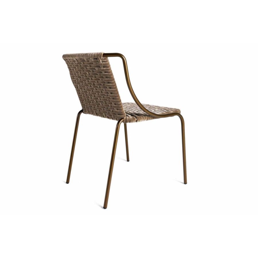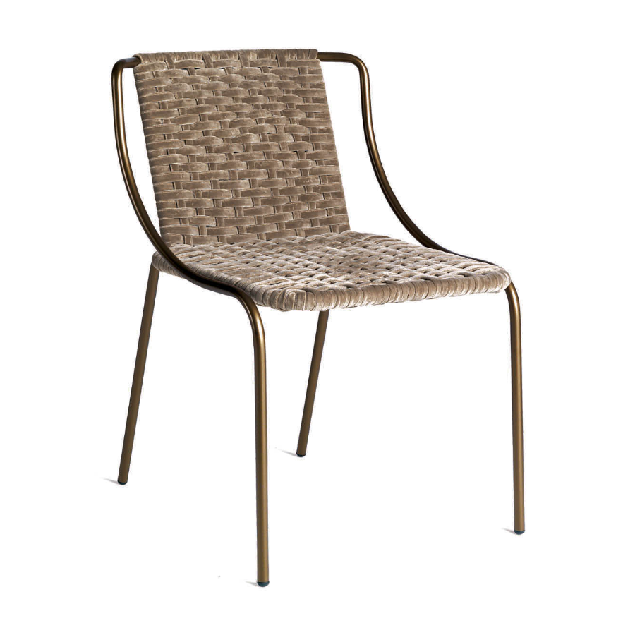 Modern chair with bronzed metal frame and seat composed of a velvet weave also available in an outdoor version with weave in technical fiber ropes. An interesting design element capable of harmoniously coexisting in indoor and outdoor settings.