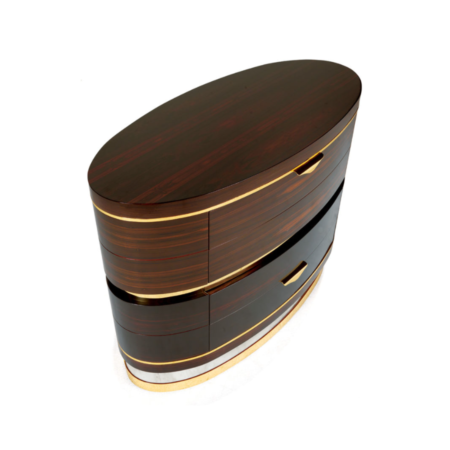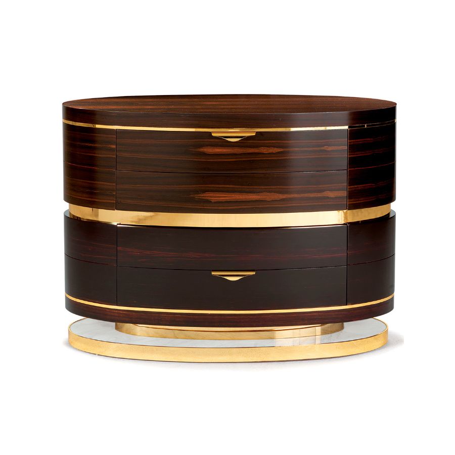 Sophisticated chest of drawers in ebony, ziricote and brass with a marble insert in the base. Its pleasant design is the result of careful research that has resulted in a harmonious union between present and past, tradition and innovation. Its style represents a vision: the art of living through furniture and accessories in which design, style, material, new workmanship and tailoring create new aesthetic codes.