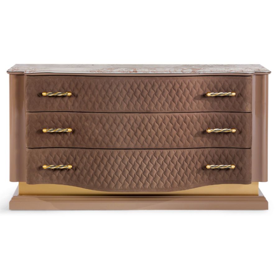Contemporary style chest of drawers with simple and sinuous lines, with a front characterized by elegant quilting and handles with precious finishes.