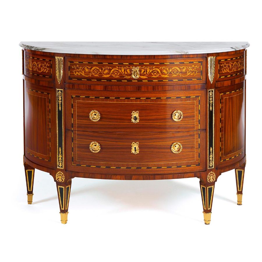 Elegant chest of drawers in mahogany and rosewood, inlaid with polished brass details and marble top.