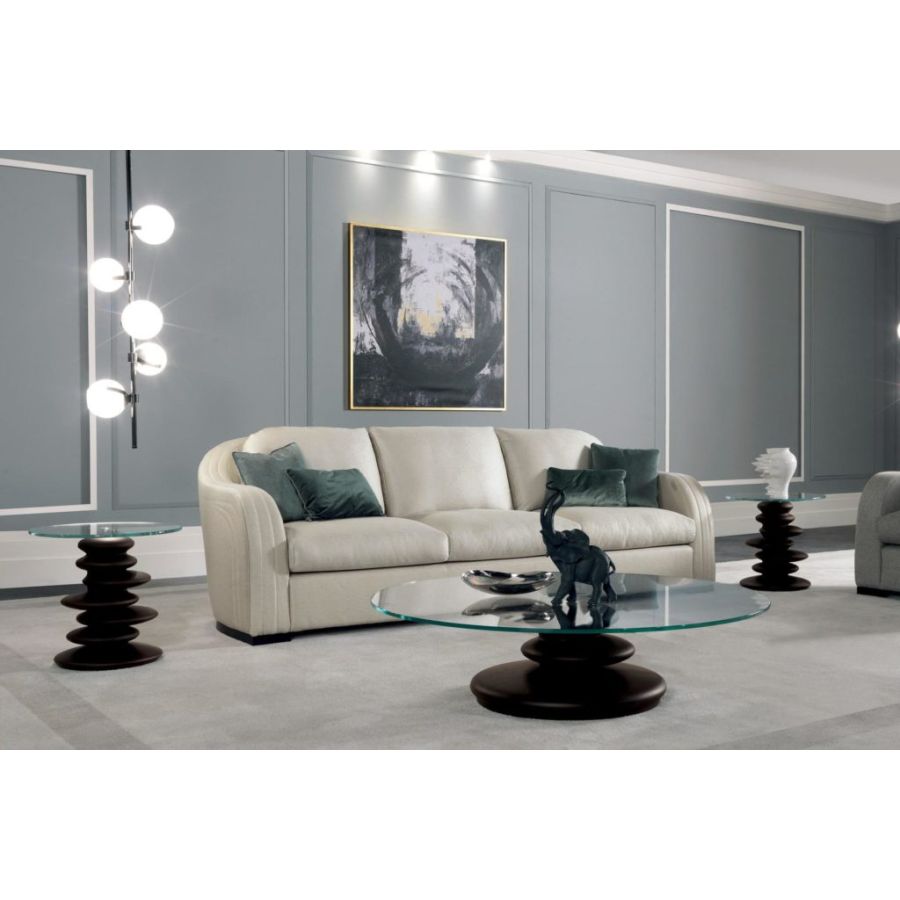 The OMETTO line consists of a dining table and coffee tables. Their design is characterized by an elegant ultra-light transparent glass top supported by a solid sculptural base that recalls elements of nature. The OMETTO coffee table is available in two versions: side table Ø cm 55 x h. 52 and central table Ø cm 130 x h. 35