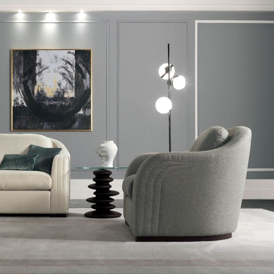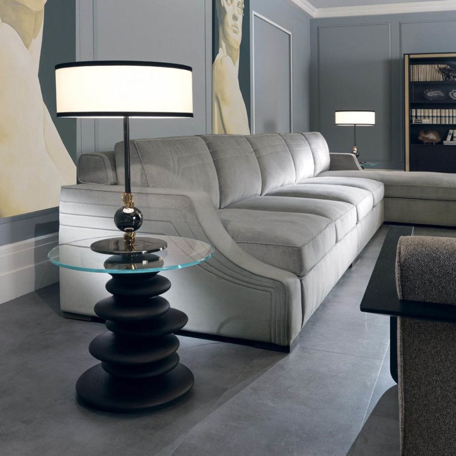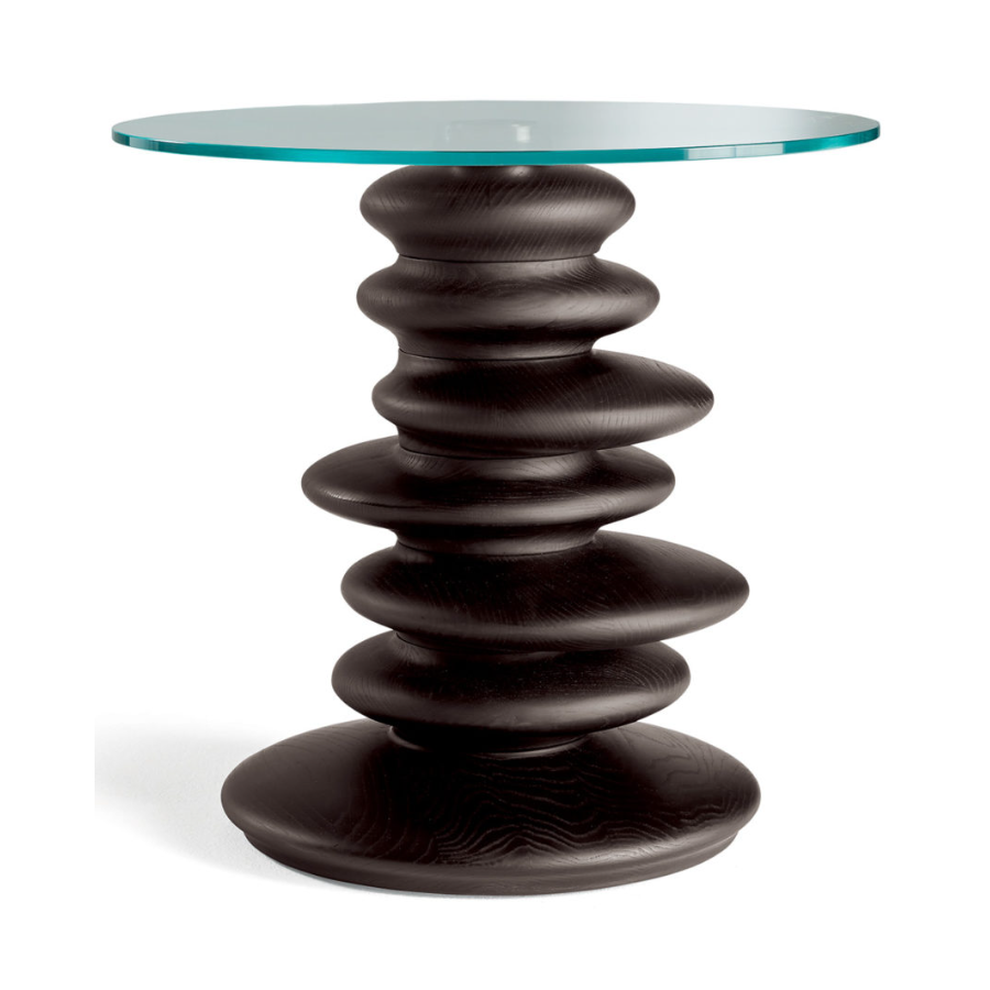 The design of the OMETTO line complements is inspired by nature. Their solid sculptural base is made up of solid canaletto walnut elements. The combination of hard and cold materials is interesting, simulating the stones found in a river with the natural warmth of wood. The balance is obtained with contrast, also represented by the combination of overlapping stones, which become a strong and solid base for a table. The glass top, clear as water, allows you to admire the beauty of the sculptural base.