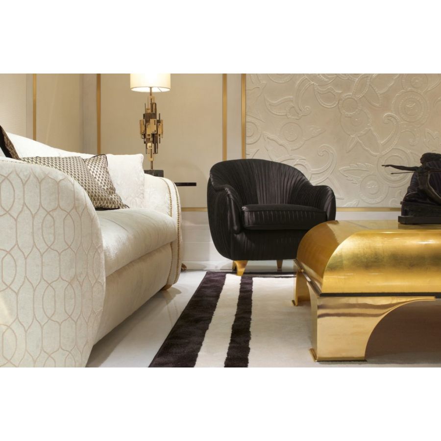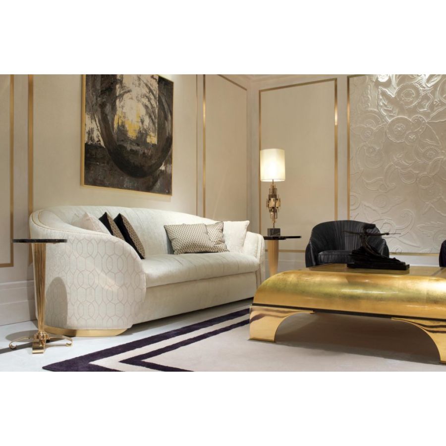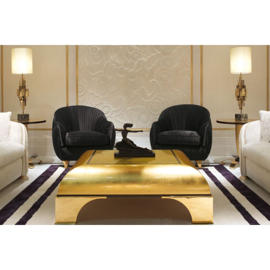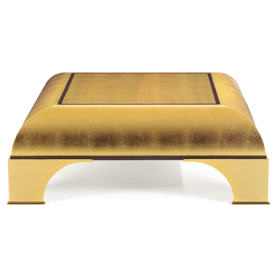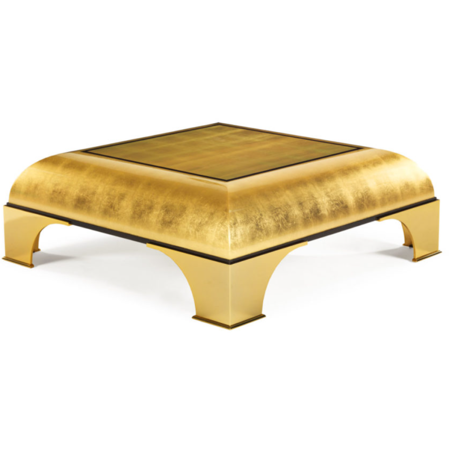 Elegant central coffee table with brass feet and wooden top decorated with gold leaf.