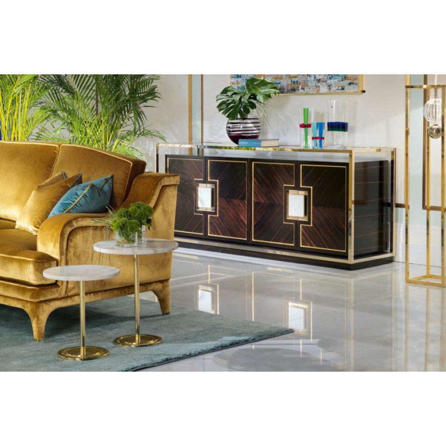 Set of coffee tables in contemporary style. Simple in shape but extremely sophisticated in their composition, T155 are a pair of coffee tables with marble tops. The brass foot is covered in gold, so as to give shine and richness to the entire environment. Their simple but exclusive design allows them to coexist in harmony with different styles.