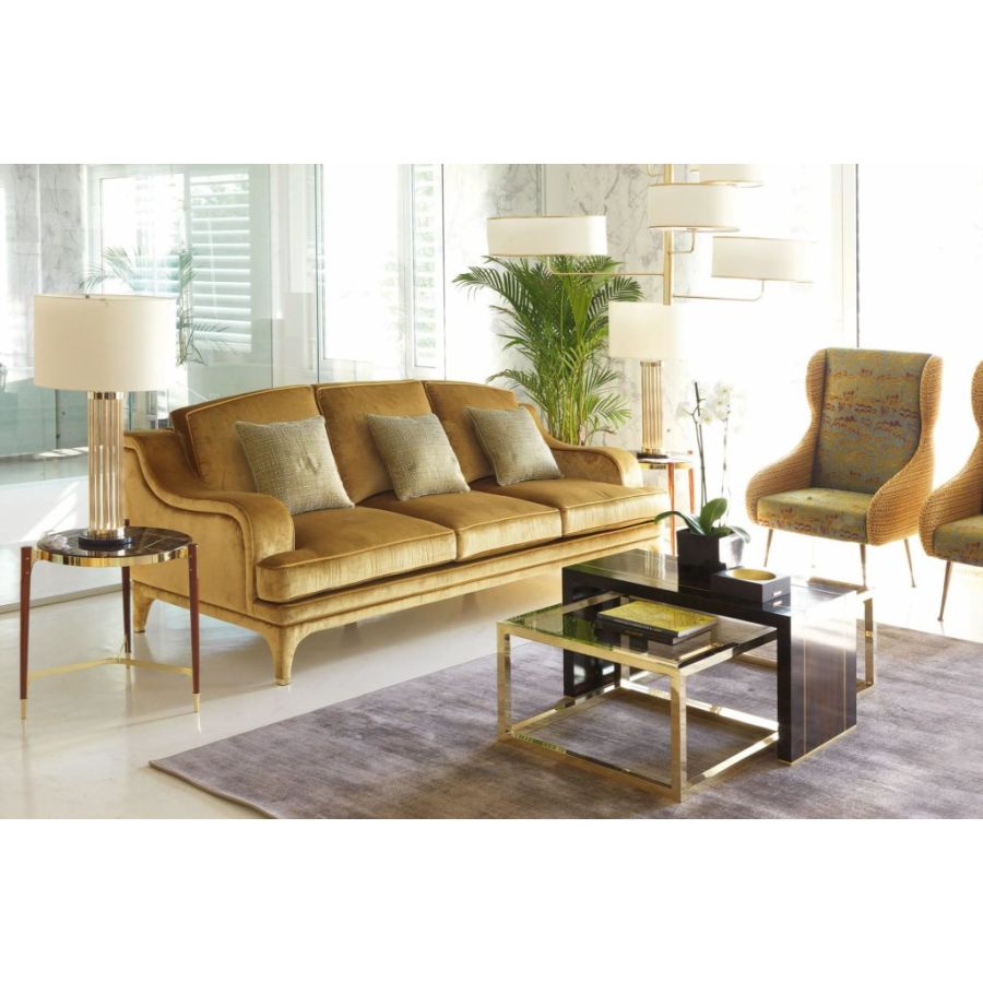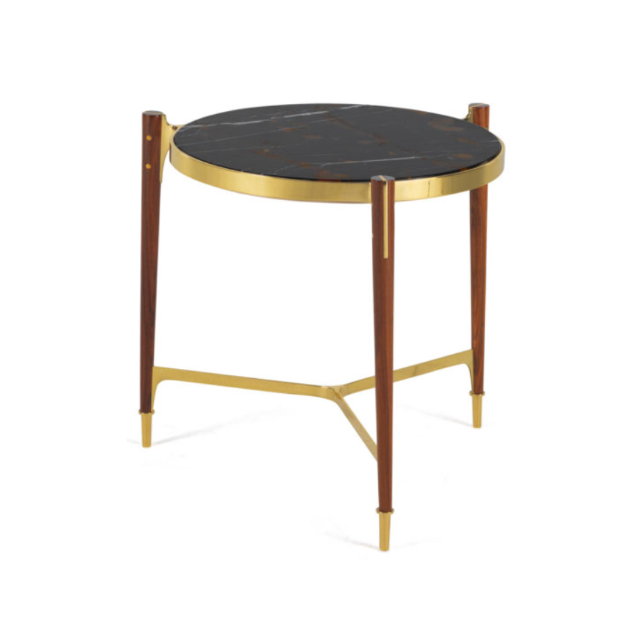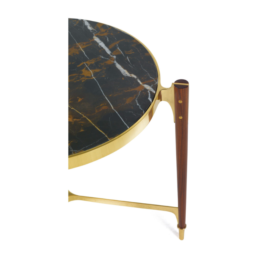 In addition to its characteristic design, this coffee table features an interesting combination of materials that make it truly unique. The elegant legs in solid rosewood have a solid base in brass with gold finish, as are other elements of the structure in brass with gold finish. The black marble top contrasts decisively with the gold details, giving character and personality to the complement and the context in which it lives.