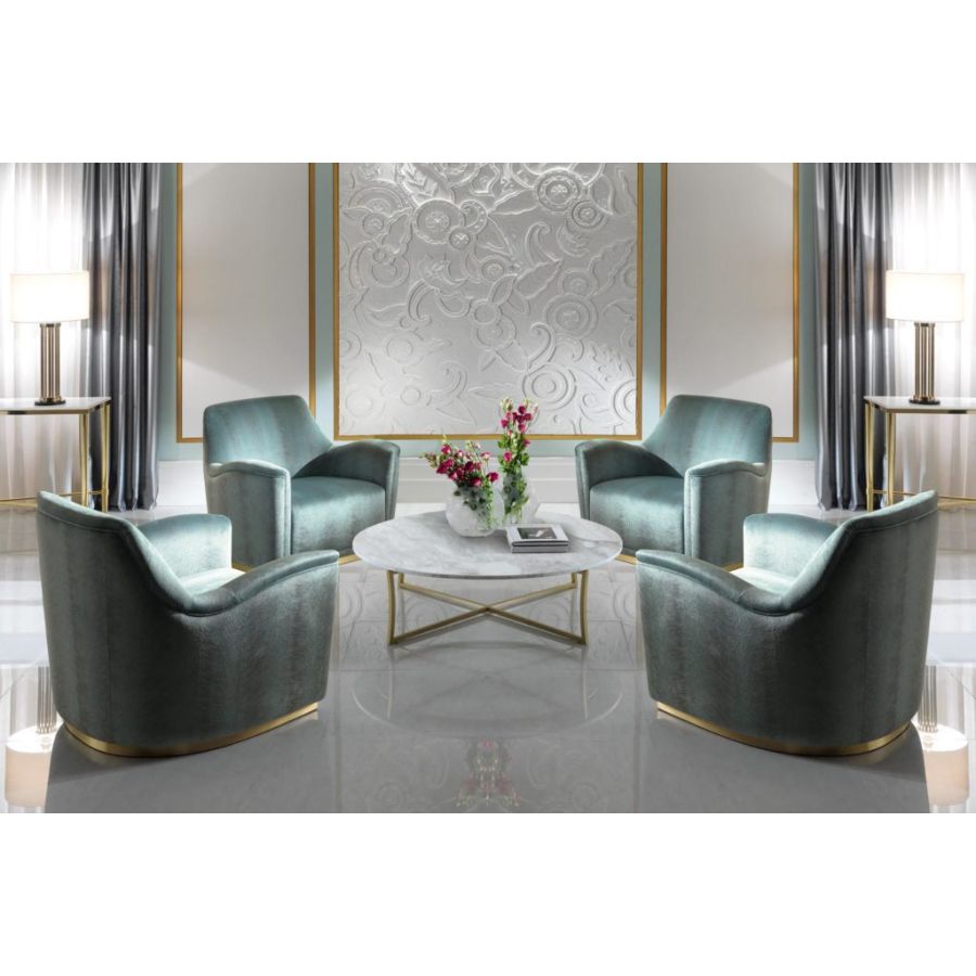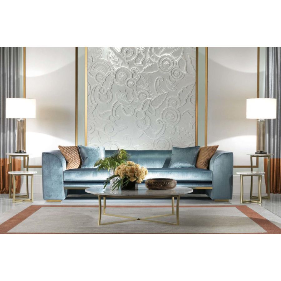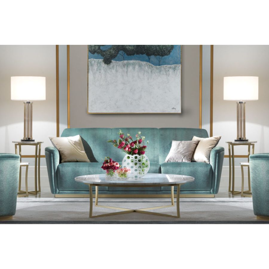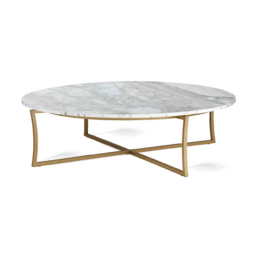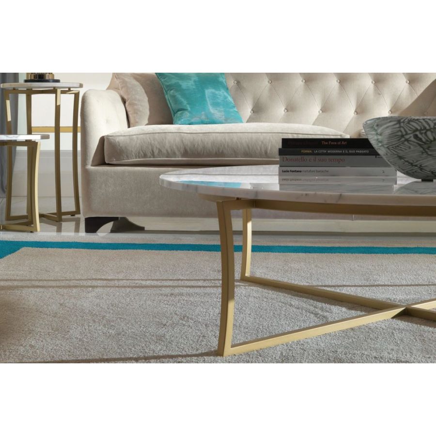 Set of contemporary style coffee tables featuring a precious satin brass structure and an elegant circular marble top. The set consists of T163/C central table measuring cm. Ø 120 x h. 35, a high side table measuring cm. Ø 40 x h. 63 and a lower side table measuring cm. Ø 40 x h. 43