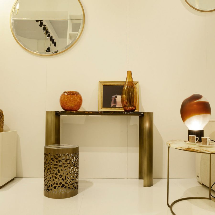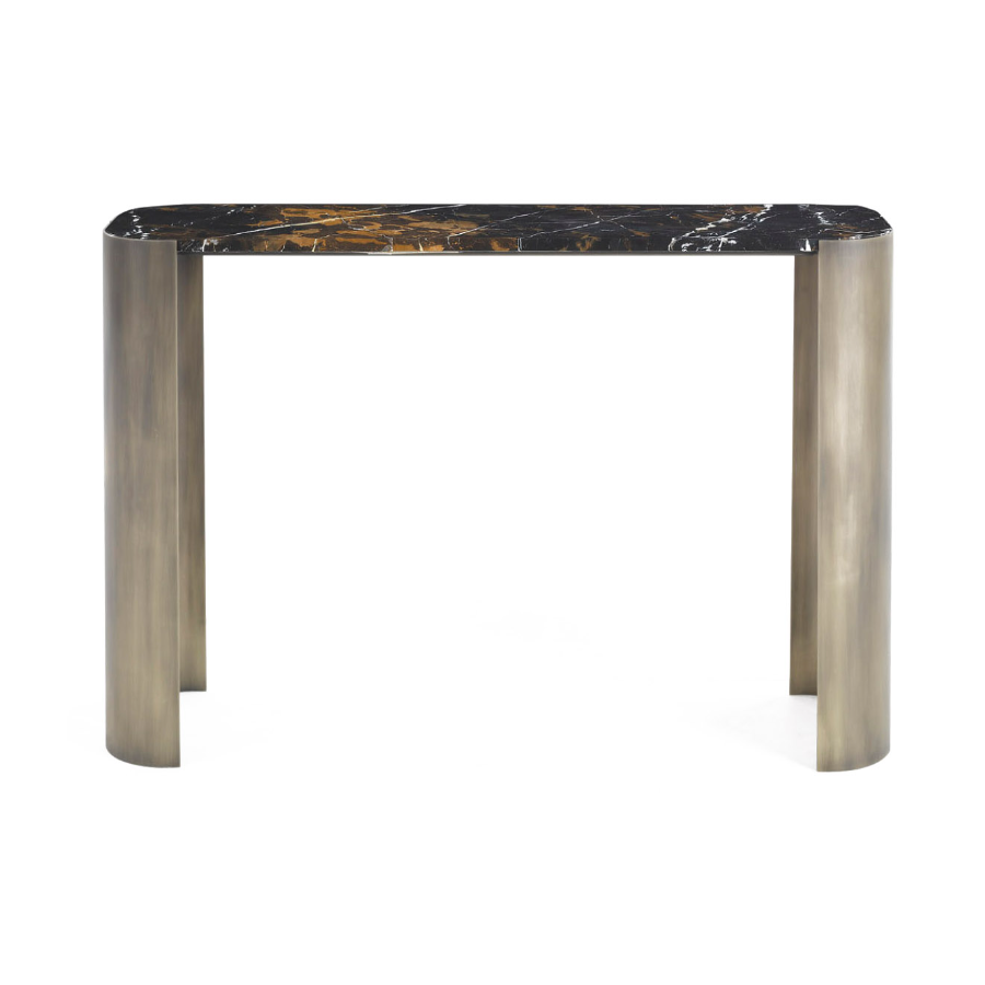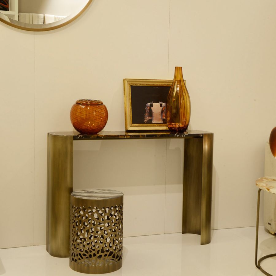 Sophisticated modern style console featuring an elegant Black and gold marble top and metal structure with bronze finish. An iconic complement with an exclusive design conceived by Studio Mamo for ZANABONI.