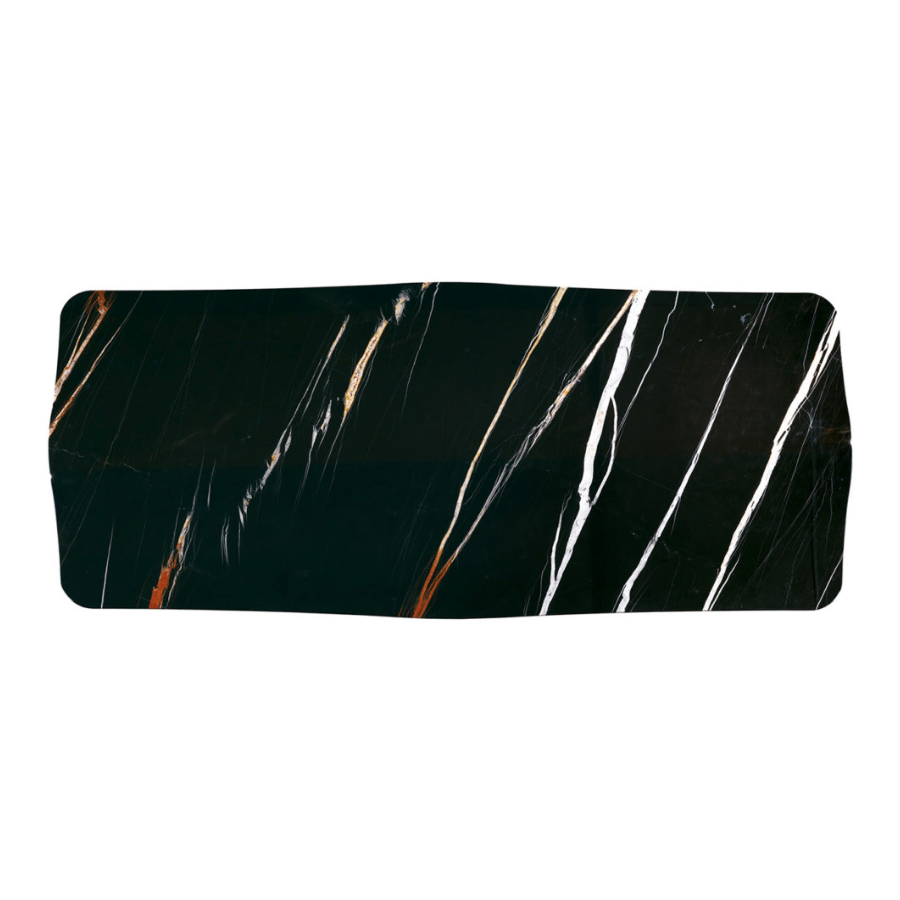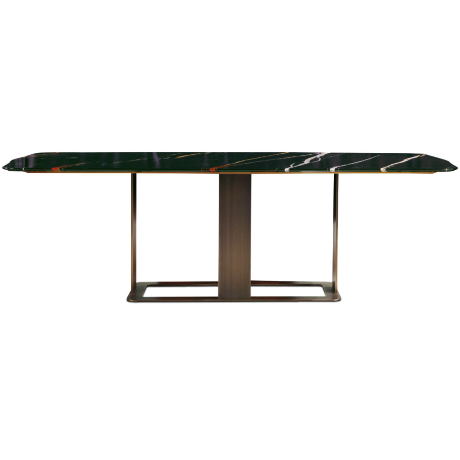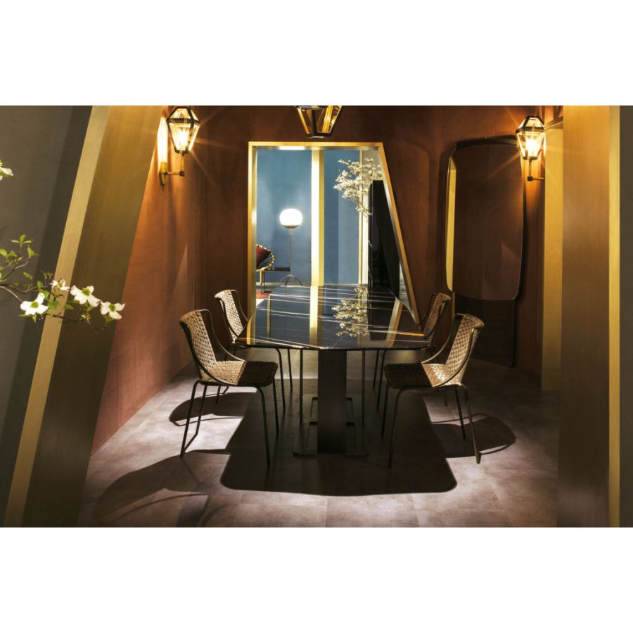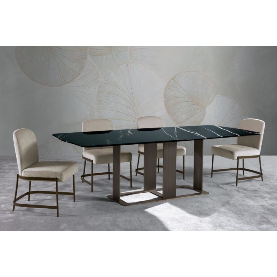 The marble dining table from the ROMANCE line is an elegant modern table with a Sahara black marble top and a bronzed brass base. ROMANCE is also available in an outdoor version with materials more suited to outdoor settings. The minimal design of this table defines its style, a perfect balance between practicality and elegance.
