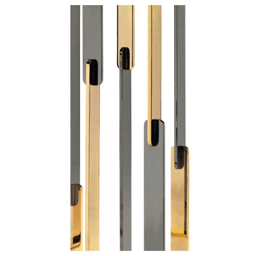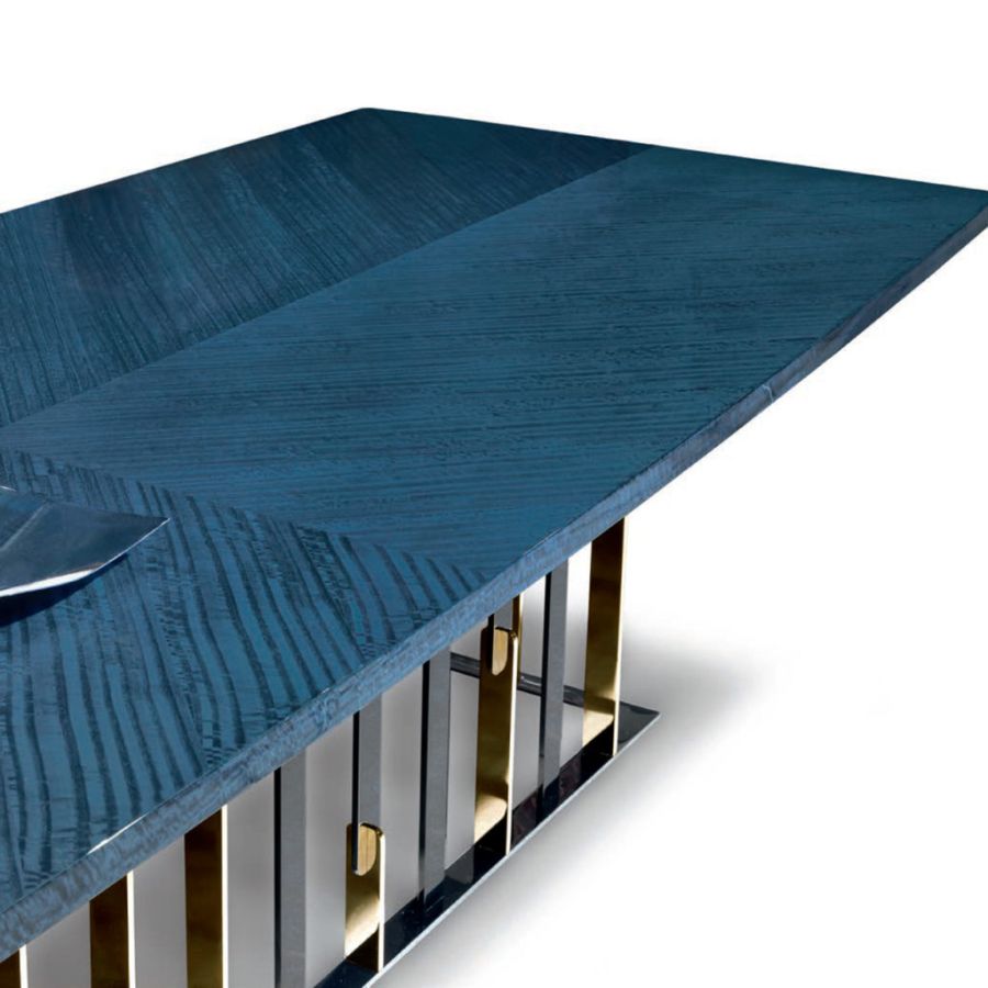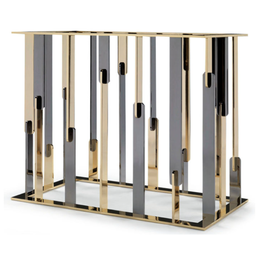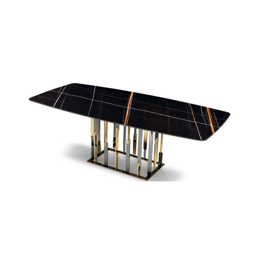 The RUBEN dining table is part of a larger family of furniture that consists of coffee tables, consoles and dining tables. Each individual element of this family is composed of a black marble top, black chrome and gold legs that interpenetrate each other, generating a suggestive play of reflections and volumes. The simplicity of these elements becomes true beauty and hides their great design and manufacturing complexity. The Ruben family of complements, with their preciousness, offers a new reading of the brand's identity style: a design that looks to the future, designed to last over time and become a new classic.