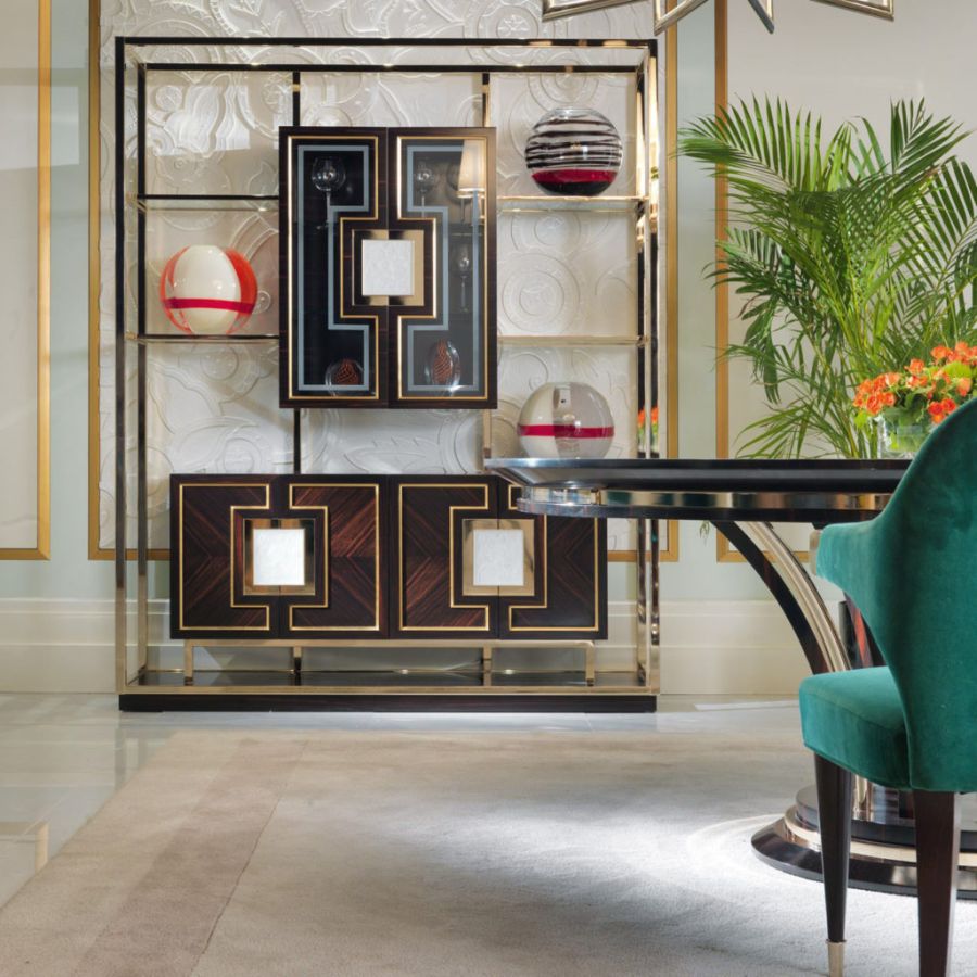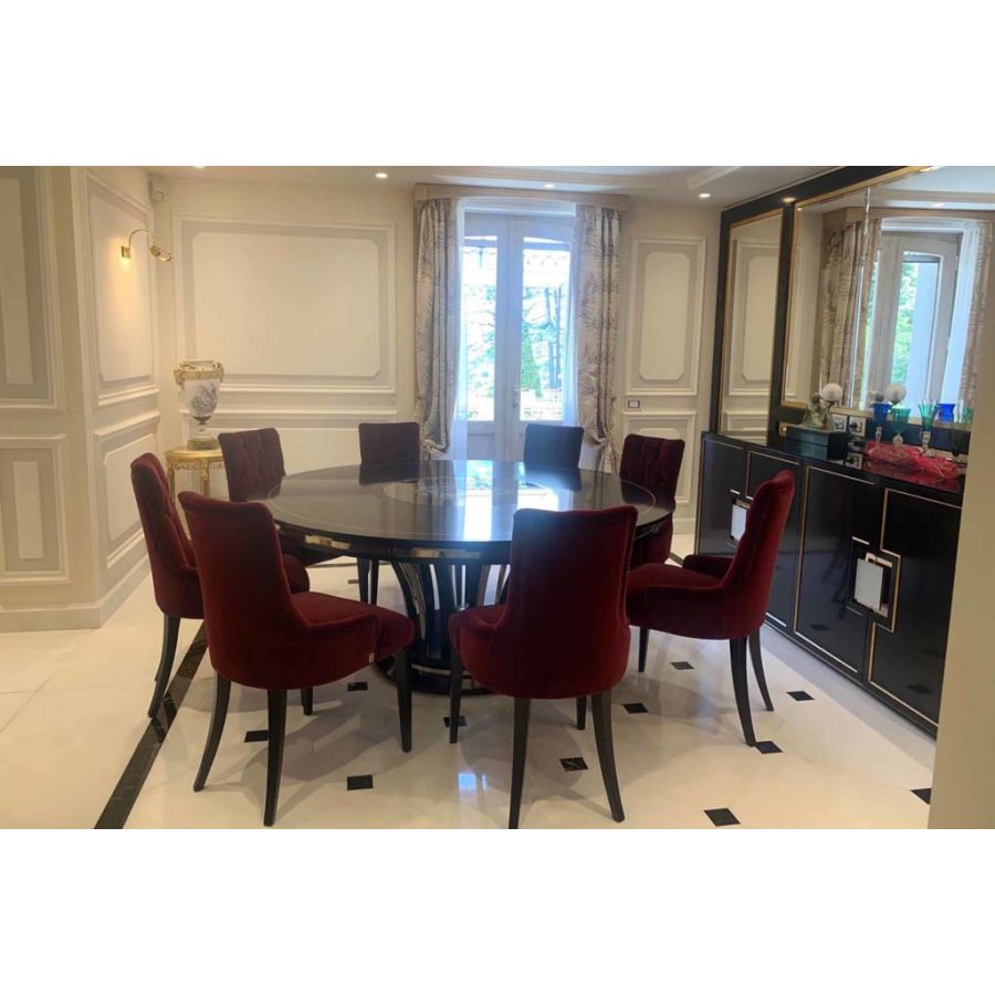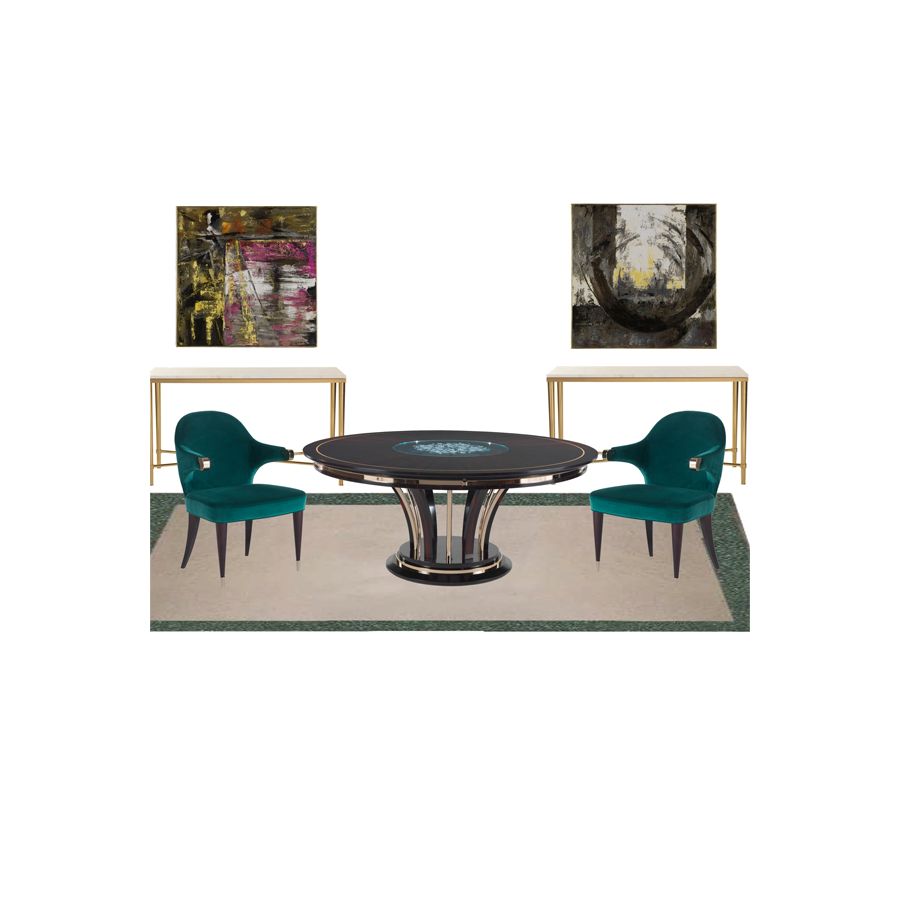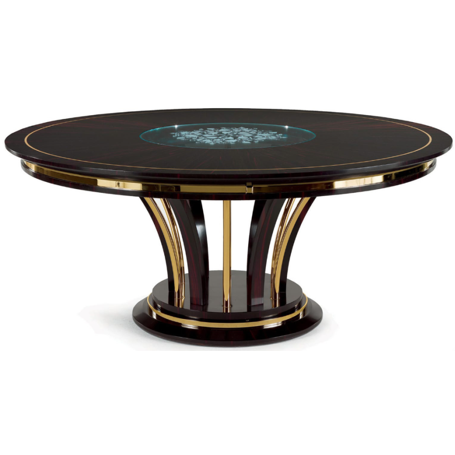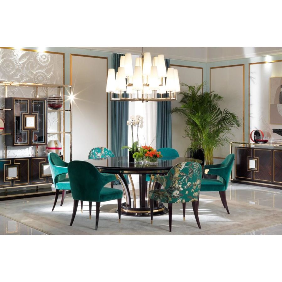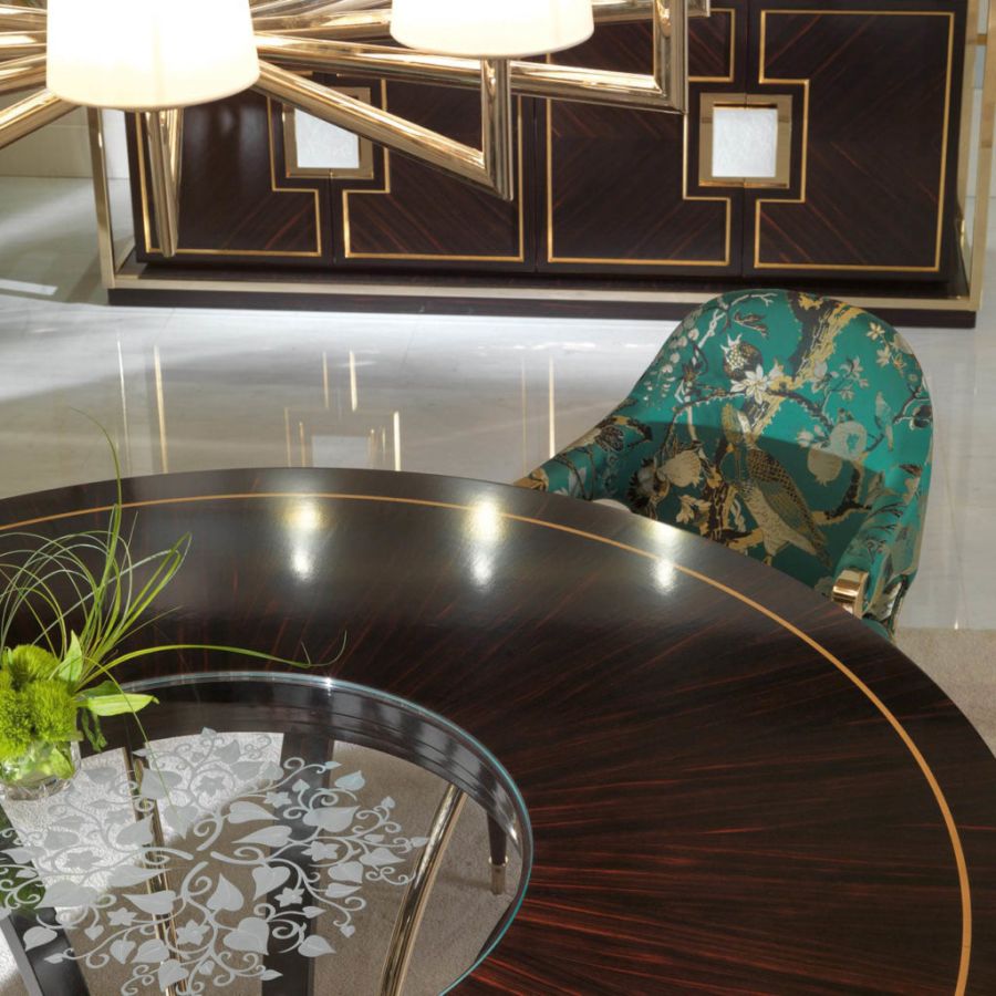 Elegant dining table with a contemporary design in ebony and brass with sophisticated precious details, glass top engraved in the center also available in the Canaletto Walnut wood version. Elegant and exclusive, the T/5090-180 dining table perfectly represents the values of the contemporary ZANABONI collection , the result of careful research, a harmonious union between present and past, tradition and innovation, to redefine a new domesticity that becomes an interpreter, with a vision of beauty with an unprecedented personality.