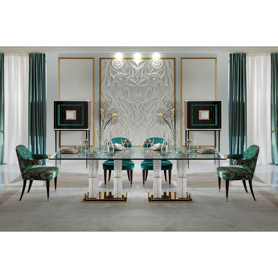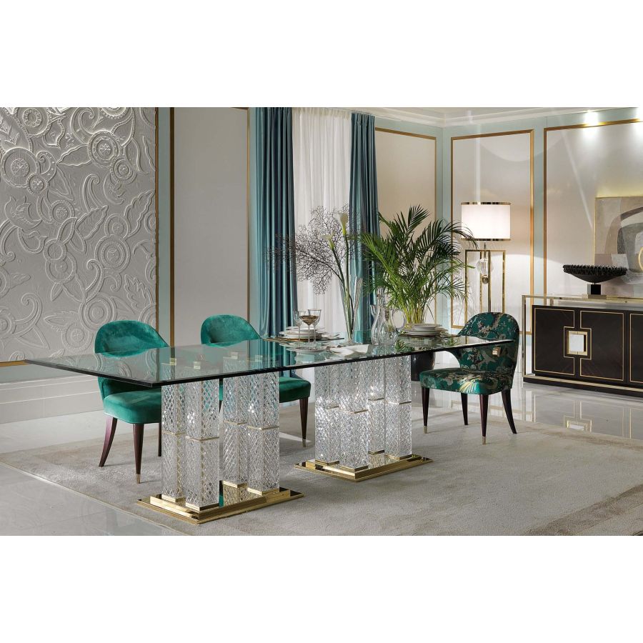 Magnificent dining table with glass top, hand-chiseled crystal bases and gold-plated finishes. The finely crafted lower part is the unmistakable feature of this collection that combines simple lines with high-quality artisan finishes.