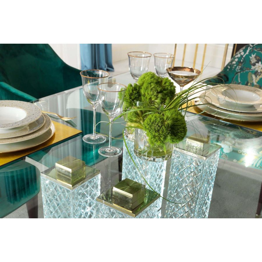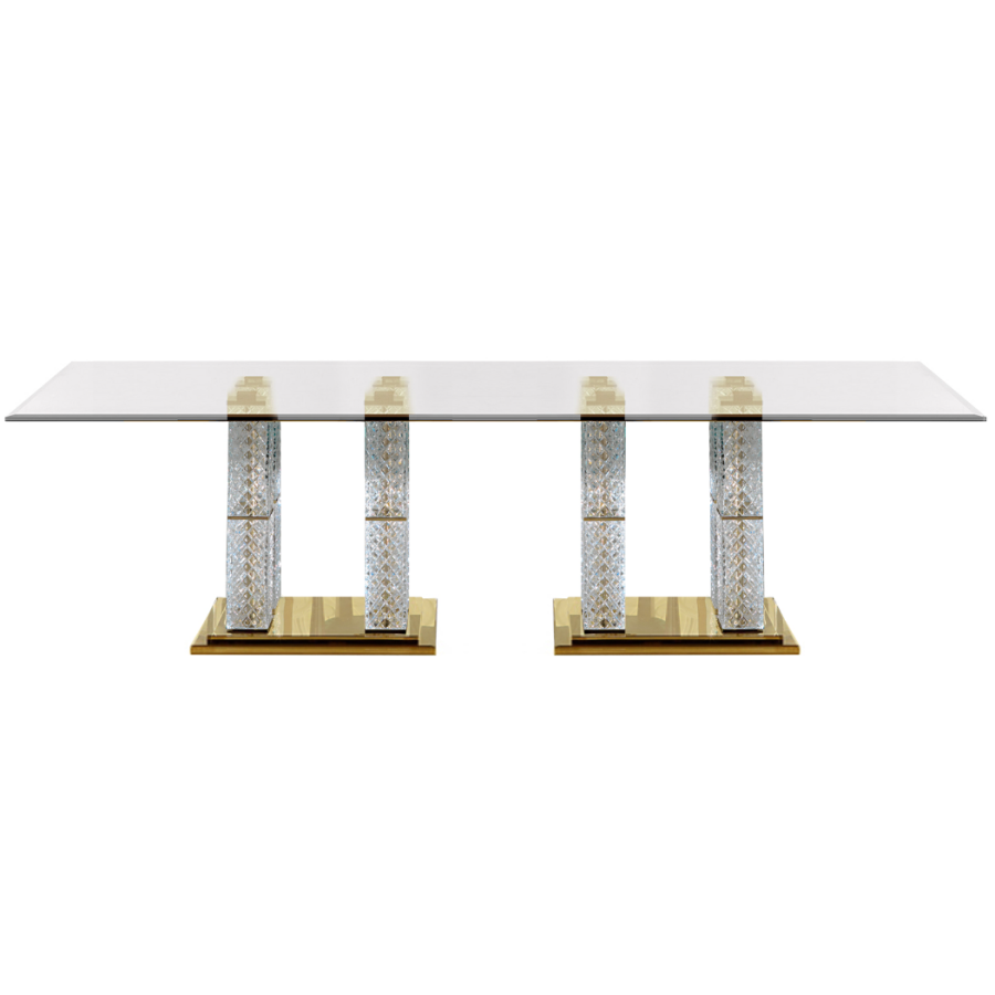 Superb glass dining table with gold finishes supported by elegant square-section pedestals in hand-chiseled crystal.